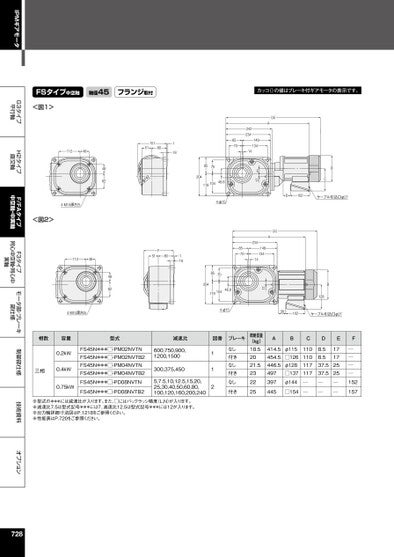 IPMギアモータG3タイプ平行軸H2タイプ直交軸F/FAタイプ中空軸・中実軸F3タイプ同心中空軸・同心中実軸モータ部・ブレーキ部仕様制御部仕様技術資料オプションFSタイプ中空軸軸径45フランジ取付カッコ()の値はブレーキ付ギアモータの表示です。<図1>BCD102ケーブル引込口φ27(A)AE17242234149134148570(A)A857023414913414857020410411948.84-φ1538102ケーブル引込口φ27B12817857020448.81041194-φ151124815151801184882142φ4-M10深さ25<図2>11248F518011848824-M10深さ25相数容量型式減速比図番ブレーキ三相0.2kW0.4kW0.75kWFS45N***□-PM02NVTNFS45N***□-PM02NVTB2FS45N***□-PM04NVTNFS45N***□-PM04NVTB2FS45N***□-PD08NVTNFS45N***□-PD08NVTB2600,750,900,1200,1500300,375,4505,7.5,10,12.5,15,20,25,30,40,50,60,80,100,120,160,200,240112なし付きなし付きなし付き概略質量(kg)18.52021.5232225ABCDEF414.5454.5446.5497397445φ115□126φ128□137φ144□154110110117117──8.58.537.537.5──17172525──────152157※型式の***には減速比が入ります。また、□にはバックラッシ精度(L,N)が入ります。※減速比7.5は型式記号***には7、減速比12.5は型式記号***には12が入ります。※出力軸詳細寸法図はP.1218をご参照ください。※性能表はP.720をご参照ください。728