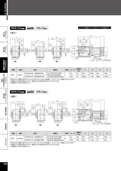 IPMギアモータG3タイプ平行軸H2タイプ直交軸F/FAタイプ中空軸・中実軸F3タイプ同心中空軸・同心中実軸モータ部・ブレーキ部仕様制御部仕様技術資料オプションFFタイプ中実軸軸径32フランジ取付カッコ()の値はブレーキ付ギアモータの表示です。B117(A)Aφ128166856188351201084-φ1310881006856168φ72H8φ49φ32h633φ32h6φ32h6φ72H8φ49φ32h633<図1>CD70124165455501941245550701655502481247012416545550L軸R軸T軸37.5102ケーブル引込口φ27相数容量型式減速比図番ブレーキ概略質量(kg)AB三相0.4kWFF32#***□-PM04NVTNFF32#***□-PM04NVTB25,7.5,10,12.5,15,20,25,30,40,50,60,80,100,120,160,200,2401なし付き1517344394.5φ128□137C6468.5D188192.5※型式の#には軸区分記号(L,R,T)が入ります。また、***には減速比、□にはバックラッシ精度(L,N)が入ります。※減速比7.5は型式記号***には7、減速比12.5は型式記号***には12が入ります。※性能表はP.725をご参照ください。B1281712(A)A85702344314913433331041198570204φ85H8φ64φ40h628814414480186465606560φ40h622414480186560φ40h6φ85H8φ64φ40h6<図2>C144D8018646560L軸R軸T軸4-φ1538102ケーブル引込口φ27FFタイプ中実軸軸径40フランジ取付相数容量型式減速比図番ブレーキ概略質量(kg)ABCD三相0.75kWFF40#***□-PD08NVTNFF40#***□-PD08NVTB25,7.5,10,12.5,15,20,25,30,40,50,60,80,100,120,160,200,2402なし付き2629397445φ144□1547277216221※型式の#には軸区分記号(L,R,T)が入ります。また、***には減速比、□にはバックラッシ精度(L,N)が入ります。※減速比7.5は型式記号***には7、減速比12.5は型式記号***には12が入ります。※性能表はP.725をご参照ください。732
