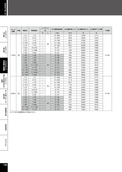 IPMギアモータG3タイプ平行軸H2タイプ直交軸F/FAタイプ中空軸・中実軸F3タイプ同心中空軸・同心中実軸モータ部・ブレーキ部仕様制御部仕様技術資料オプションモータ容量枠番減速比実減速比1/51/7.51/101/12.51/151/201/251/301/401/501/601/801/1001/120※1/160※1/200※1/2401/51/7.51/101/12.51/151/201/251/301/401/501/601/801/52/151/104/491/1514/27511/2802/591/401/491/607/55011/11201/1187/110011/22401/2361/52/151/104/491/1514/27511/2802/591/401/491/607/5501.5kW552.2kW55※1/100※1/12011/11201/118注.P.734の注意事項を必ずお読みください。バックラッシ分L30303030N———————————————————————————————出力軸回転速度出力軸許容トルク出力軸許容O.H.L.出力軸許容スラスト荷重寸法図r/min0〜3600〜2400〜1800〜1460〜1200〜910〜700〜610〜450〜360〜300〜220〜170〜150〜110〜8.80〜7.60〜3600〜2400〜1800〜1460〜1200〜910〜700〜610〜450〜360〜300〜220〜170〜15N・m32.449.666.882.199.313116519826332939750262875398498498447.871.395.7118142190238286381476571723905967N4700534057806130632063206320632063206320632064206420750083309020980047005340578061306320632063206320632063206320642064207500N1177132414221520156915691569156915691569156916181618186320592256245211771324142215201569156915691569156915691569161816181863P.743P.743736
