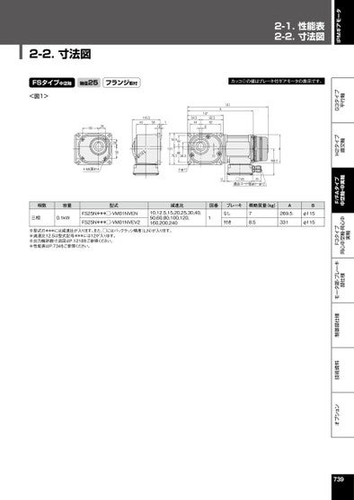 IPMギアモータオプション技術資料制御部仕様モータ部・ブレーキ部仕様F3タイプ同心中空軸・同心中実軸F/FAタイプ中空軸・中実軸H2タイプ直交軸G3タイプ平行軸2-1.性能表2-2.⼨法図2-2.⼨法図FSタイプ中空軸軸径25フランジ取付カッコ()の値はブレーキ付ギアモータの表示です。<図1>6628116.5405911254.544147892.582(A)A2850114.5φ54.5441316676.528.34-M6深さ144-φ11119B108.2□10535適合コード径φ8~φ12相数容量型式減速比図番ブレーキ概略質量(kg)A三相0.1kWFS25N***□-VM01NVENFS25N***□-VM01NVEV210,12.5,15,20,25,30,40,50,60,80,100,120,160,200,2401なし付き78.5269.5331Bφ115φ115※型式の***には減速比が入ります。また、□にはバックラッシ精度(L,N)が入ります。※減速比12.5は型式記号***には12が入ります。※出力軸詳細寸法図はP.1218をご参照ください。※性能表はP.734をご参照ください。739