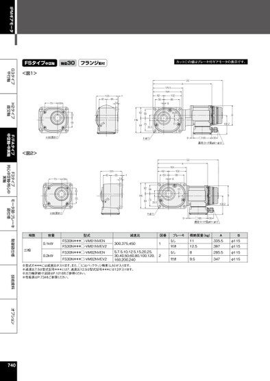 IPMギアモータG3タイプ平行軸H2タイプ直交軸F/FAタイプ中空軸・中実軸F3タイプ同心中空軸・同心中実軸モータ部・ブレーキ部仕様制御部仕様技術資料オプションFSタイプ中空軸軸径30フランジ取付カッコ()の値はブレーキ付ギアモータの表示です。<図1><図2>12342651143355115φ12342651143355115φ73334-M8深さ1773334-M8深さ17(A)A170.5164102908625015.511B108.29□10535適合コード径φ8~φ12(A)A625016481029011B108.29□105適合コード径φ8~φ12356250146728433.34-φ116250146728433.34-φ11相数容量型式減速比図番ブレーキ三相0.1kW0.2kWFS30N***□-VM01NVENFS30N***□-VM01NVEV2FS30N***□-VM02NVENFS30N***□-VM02NVEV2300,375,4505,7.5,10,12.5,15,20,25,30,40,50,60,80,100,120,160,200,24012なし付きなし付き概略質量(kg)1112.589.5A335.5397285.5347Bφ115φ115φ115φ115※型式の***には減速比が入ります。また、□にはバックラッシ精度(L,N)が入ります。※減速比7.5は型式記号***には7、減速比12.5は型式記号***には12が入ります。※出力軸詳細寸法図はP.1218をご参照ください。※性能表はP.734をご参照ください。740