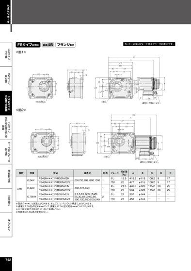 IPMギアモータG3タイプ平行軸H2タイプ直交軸F/FAタイプ中空軸・中実軸F3タイプ同心中空軸・同心中実軸モータ部・ブレーキ部仕様制御部仕様技術資料オプションFSタイプ中空軸軸径45フランジ取付カッコ()の値はブレーキ付ギアモータの表示です。<図1>1124815151801184882142φ4-M10深さ25<図2>11248152.5518011848824-M10深さ25(A)A242234149134148570E17(A)A857023414149134BCD□10535適合コード径φ8~φ1217B126.238.5□10535適合コード径φ8~φ12857020448.81041194-φ15857020410448.81194-φ15相数容量型式減速比図番ブレーキ三相0.2kW0.4kW0.75kWFS45N***□-VM02NVENFS45N***□-VM02NVEV2FS45N***□-VM04NVENFS45N***□-VM04NVEV2FS45N***□-VD08NVENFS45N***□-VD08NVEV2600,750,900,1200,1500300,375,4505,7.5,10,12.5,15,20,25,30,40,50,60,80,100,120,160,200,240112なし付きなし付きなし付き概略質量(kg)18.52021.5232225ABCDE415.5477446.5504397452φ115φ115φ128φ128φ144φ144108.2108.2115.2115.2──993838──17172525──※型式の***には減速比が入ります。また、□にはバックラッシ精度(L,N)が入ります。※減速比7.5は型式記号***には7、減速比12.5は型式記号***には12が入ります。※出力軸詳細寸法図はP.1218をご参照ください。※性能表はP.734をご参照ください。742