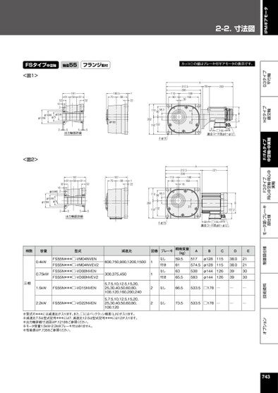 2-2.⼨法図IPMギアモータオプション技術資料制御部仕様モータ部・ブレーキ部仕様F3タイプ同心中空軸・同心中実軸F/FAタイプ中空軸・中実軸H2タイプ直交軸G3タイプ平行軸FSタイプ中空軸軸径55フランジ取付カッコ()の値はブレーキ付ギアモータの表示です。□105適合コード径φ8~φ12BC35DE21A59203312.52981881681611090<図1>18159616132102φ100H8φ79φ120h8φ55H855出力軸部詳細2<図2>180.57098122φ16532559.3110902621521324-φ1818159616132187709812232102φ55H8φ100H8φ120h8φ792555出力軸部詳細A22111090312.5298188168161109059.32621321524-φ1821B137.23560□105適合コード径φ8~φ12相数容量型式減速比図番ブレーキ0.4kW0.75kWFS55N***□-VM04NVENFS55N***□-VM04NVEV2FS55N***□-VD08NVENFS55N***□-VD08NVEV2三相1.5kWFS55N***□-VD15NVEN2.2kWFS55N***□-VD22NVEN600,750,900,1200,1500300,375,4505,7.5,10,12.5,15,20,25,30,40,50,60,80,100,120,160,200,2405,7.5,10,12.5,15,20,25,30,40,50,60,80,100,1201122※型式の***には減速比が入ります。また、□にはバックラッシ精度(L,N)が入ります。※減速比7.5は型式記号***には7、減速比12.5は型式記号***には12が入ります。※出力軸詳細寸法図はP.1218をご参照ください。※モータ容量1.5kW・2.2kWブレーキ付はありません。※性能表はP.735をご参照ください。概略質量(kg)59.5616365.5ABC517574.5538593φ128φ128φ144φ14411511512612666.5533.5□178─なし付きなし付きなしなし73.5533.5□178─D38.038.03939──E21213030──743