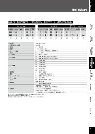 機種・型式記号IPMギアモータオプション技術資料制御部仕様モータ部・ブレーキ部仕様F3タイプ同心中空軸・同心中実軸F/FAタイプ中空軸・中実軸H2タイプ直交軸G3タイプ平行軸F3タイプ防水IPMギアモータ・防水IPMブレーキ付ギアモータ<同心中空軸/F3S>ギアヘッド型式モータ型式ブレーキ仕様オプション取付区分枠番軸区分減速比バックラッシ精度モータ区分モータ仕様容量電源電圧規格ターミナルボックスブレーキ補助記号仕様記号F3SF3S①3045②NN③50160④LN⑤VV⑥MD⑦0408⑧NN⑨VV⑩EE⑪NV2⑫X⑬AA⑭①取付区分②枠番および出力軸径③軸区分④減速比⑤バックラッシ精度(注1)⑥モータ区分⑦モータ仕様⑧モータ容量⑨電源電圧⑩規格⑪ターミナルボックス⑫ブレーキ仕様(注3)⑬補助記号⑭仕様記号:炭素鋼:特殊仕様追加認識記号:バックラッシ精度30分(一部機種除く):ノーマル:防水モータ(IP65):F種標準モータ(0.1kW〜0.4kW):F種標準モータ(0.75kW〜2.2kW):三相0.1kW:三相0.2kW:三相0.4kW:三相0.75kW:三相1.5kW:三相2.2kW:200V〜230V:UL・CE・CCC・cUL注2):E型ターミナルボックス(アルミ):ブレーキなし:防水200V級ブレーキ付F3S:同心中空軸出力軸径N5:1/5〜240:1/240LNVMD010204081522NVENV2空欄:標準仕様X整流器内蔵結線指示記号詳細はP.852の仕様記号一覧をご参照ください。ターミナルボックス位置指示記号詳細はP.857の仕様記号一覧をご参照ください。その他仕様記号はP.1249の仕様記号一覧をご参照ください。注1.バックラッシ精度は減速機単体での精度であり位置決め精度とは異なります。注2.1.5kW、2.2kWはCCC規格品ではありません。注3.1.5kW、2.2kWの防水ブレーキ付ギアモータはありませんのでご注意ください。747