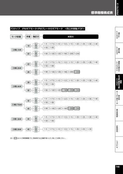 標準機種構成表IPMギアモータオプション技術資料制御部仕様モータ部・ブレーキ部仕様F3タイプ同心中空軸・同心中実軸F/FAタイプ中空軸・中実軸H2タイプ直交軸G3タイプ平行軸7491/51/7.51/101/12.51/151/201/251/301/401/501/601/801/1001/1201/1601/2001/2401/51/7.51/101/12.51/151/201/251/301/401/501/601/801/1001/1201/1601/2001/2401/51/7.51/101/12.51/151/201/251/301/401/501/601/801/1001/1201/1601/2001/2401/51/7.51/101/12.51/151/201/251/301/401/501/601/801/1001/1201/1601/2001/2401/51/7.51/101/12.51/151/201/251/301/401/501/601/51/7.51/101/12.51/151/201/251/30LRTLRTLRTLRTLRTLRTLRTLRTLRTLRT三相0.1kW三相0.2kW三相0.4kW三相0.75kW三相1.5kW三相2.2kW18222228283232404040注1.はトルク制限機種です。性能表の出力軸許容トルクに特にご注意ください。F3タイプIPMギアモータ・IPMブレーキ付ギアモータ<同心中実軸/F3F>モータ容量枠番軸区分減速比