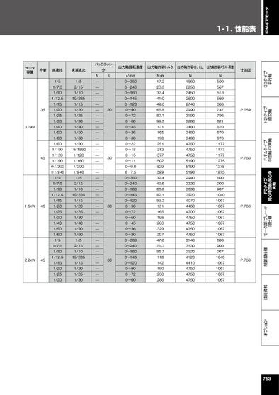 1-1.性能表IPMギアモータオプション技術資料制御部仕様モータ部・ブレーキ部仕様F3タイプ同心中空軸・同心中実軸F/FAタイプ中空軸・中実軸H2タイプ直交軸G3タイプ平行軸モータ容量枠番減速比実減速比0.75kW35451.5kW452.2kW451/51/7.51/101/12.51/151/201/251/301/401/501/601/801/1001/1201/160※1/200※1/2401/51/7.51/101/52/151/1019/2351/151/201/251/301/401/501/601/8019/18801/1201/1601/2001/2401/52/151/101/12.519/2351/151/201/251/301/401/501/601/51/7.51/101/12.51/151/201/251/301/151/201/251/301/401/501/601/52/151/1019/2351/151/201/251/30バックラッシ分L30303030N————————————————————————————————————出力軸回転速度出力軸許容トルク出力軸許容O.H.L.出力軸許容スラスト荷重r/min0〜3600〜2400〜1800〜1450〜1200〜900〜720〜600〜450〜360〜300〜220〜180〜150〜110〜9.00〜7.50〜3600〜2400〜1800〜1450〜1200〜900〜720〜600〜450〜360〜300〜3600〜2400〜1800〜1450〜1200〜900〜720〜60N・m17.223.832.441.049.666.882.199.313116519825131337750252952932.449.666.882.199.313116519826332939747.871.395.7118142190238286N196022502450260027402990319032803480348034804750475047505190519051902940333036303920407044604700475047504750475031403530392041204410475047504750N5005676136696867477968218708708701177117711771275127512758009009671040106710671067106710671067106780090096710401067106710671067寸法図P.759P.760P.760P.760753
