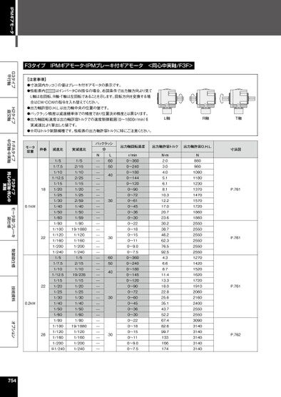 IPMギアモータG3タイプ平行軸H2タイプ直交軸F/FAタイプ中空軸・中実軸F3タイプ同心中空軸・同心中実軸モータ部・ブレーキ部仕様制御部仕様技術資料オプションF3タイプIPMギアモータ・IPMブレーキ付ギアモータ<同心中実軸/F3F>【注意事項】●寸法図内カッコ()の値はブレーキ付ギアモータの表示です。●性能表内はインバータCW指令の場合、右図条件で出力軸方向より見てL軸は右回転、R軸・T軸は左回転であることを示します。回転方向を変換する場合はCW・CCWの指令を入れ替えてください。●出力軸許容O.H.L.は出力軸中央の位置の値です。●バックラッシ精度は減速機単体での精度であり位置決め精度とは異なります。●出力軸回転速度は出力軸許容トルクでの速度制御範囲(0〜1800r/min)を実減速比より算出した値です。●※印はトルク制限機種です。性能表の出力軸許容トルクに特にご注意ください。L軸R軸T軸モータ容量0.1kW0.2kW枠番減速比実減速比分バックラッシ出力軸回転速度出力軸許容トルク出力軸許容O.H.L.1/51/7.51/101/12.51/151/201/251/301/401/501/601/801/1001/1201/1601/2001/2401/51/7.51/101/12.51/151/201/251/301/401/501/601/801/1001/1201/1601/200※1/240182222281/52/151/102/251/151/201/252/591/401/501/591/8019/18801/1201/1601/2001/2401/52/151/1019/2351/151/201/251/301/401/501/601/8019/18801/1201/1601/2001/240L60504030306050403030N——————————————————————————————————r/min0〜3600〜2400〜1800〜1440〜1200〜900〜720〜610〜450〜360〜300〜220〜180〜150〜110〜9.00〜7.50〜3600〜2400〜1800〜1450〜1200〜900〜720〜600〜450〜360〜300〜220〜180〜150〜110〜9.00〜7.5N・m2.03.04.05.16.18.110.312.217.020.723.630.238.746.262.376.592.54.36.68.711.413.318.022.825.635.143.752.267.482.699.7133166174N88098010801180123013701470157017201860186025502550255025502550255012701420152016201720191020602160240025502550309031403140314031403140寸法図P.761P.761P.761P.762754