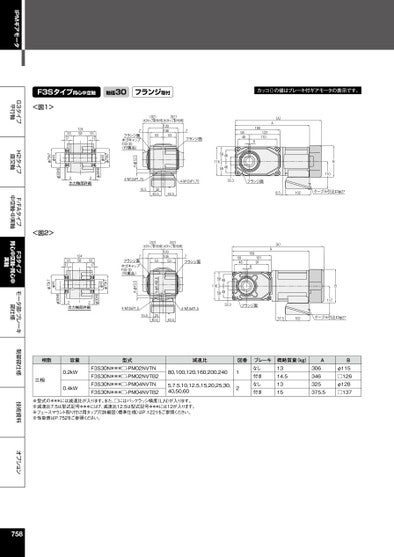 IPMギアモータG3タイプ平行軸H2タイプ直交軸F/FAタイプ中空軸・中実軸F3タイプ同心中空軸・同心中実軸モータ部・ブレーキ部仕様制御部仕様技術資料オプションF3Sタイプ同心中空軸軸径30フランジ取付カッコ()の値はブレーキ付ギアモータの表示です。<図1>(A)A584618012211087フランジ面58461165846B1104-M12xP1.7533.3フランジ面7フランジ面ホゴキャップF3S-30(付属品)4-φ12.54-M12xP1.751245833173317φ75h7φ44φ30H822出力軸部詳細φ30H8φ44φ75h7(82)(ホゴキャップ取り付け時)5353(82)ホゴキャップ取り付け時)12010615.53045.545.58.5102ケーブル引込口φ2715.52540.540.537.5102ケーブル引込口φ27B1174-M10xP1.54-M10xP1.533.3フランジ面584811648584-φ8.4以上4-φ10.5φ75h7φ44φ30H822出力軸部詳細φ30H8φ44φ75h7相数容量型式減速比図番三相0.2kW0.4kWF3S30N***□-PM02NVTNF3S30N***□-PM02NVTB2F3S30N***□-PM04NVTNF3S30N***□-PM04NVTB280,100,120,160,200,2405,7.5,10,12.5,15,20,25,30,40,50,6012ブレーキなし付きなし付き概略質量(kg)1314.51315A306346325375.5Bφ115□126φ128□137※型式の***には減速比が入ります。また、□にはバックラッシ精度(L,N)が入ります。※減速比7.5は型式記号***には7、減速比12.5は型式記号***には12が入ります。※フェースマウント取り付け用タップ穴詳細図(標準仕様)はP.1221をご参照ください。※性能表はP.752をご参照ください。758<図2>12458331733177フランジ面ホゴキャップF3S-30(付属品)(82)(ホゴキャップ取り付け時)(82)(ホゴキャップ取り付け時)12010653537フランジ面(A)A5848159810191