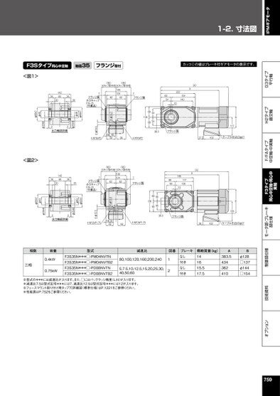 1-2.⼨法図IPMギアモータオプション技術資料制御部仕様モータ部・ブレーキ部仕様F3タイプ同心中空軸・同心中実軸F/FAタイプ中空軸・中実軸H2タイプ直交軸G3タイプ平行軸F3Sタイプ同心中空軸軸径35フランジ取付カッコ()の値はブレーキ付ギアモータの表示です。B11737.5102ケーブル引込口φ27(A)A6854222154140107フランジ面13668545468(95)(ホゴキャップ取り付け時)(95)ホゴキャップ取り付け時)13812462624-φ13.738.3フランジ面184058584-M16xP24-φ16.54-M16xP2<図1>38142662038207フランジ面ホゴキャップF3S-35(付属品)φ85h7φ49φ49φ85h7φ35H822出力軸部詳細φ35H8<図2>7594-M12xP1.75183048484-M12xP1.7538102ケーブル引込口φ27B1281366856566838.3フランジ面4-φ10.44-φ12.5φ85h7φ49φ35H822出力軸部詳細φ35H8φ49φ85h7相数容量型式減速比図番三相0.4kW0.75kWF3S35N***□-PM04NVTNF3S35N***□-PM04NVTB2F3S35N***□-PD08NVTNF3S35N***□-PD08NVTB280,100,120,160,200,2405,7.5,10,12.5,15,20,25,30,40,50,6012ブレーキなし付きなし付き概略質量(kg)141615.517.5A383.5434362410Bφ128□137φ144□154※型式の***には減速比が入ります。また、□にはバックラッシ精度(L,N)が入ります。※減速比7.5は型式記号***には7、減速比12.5は型式記号***には12が入ります。※フェースマウント取り付け用タップ穴詳細図(標準仕様)はP.1221をご参照ください。※性能表はP.752をご参照ください。(95)(95)(ホゴキャップ取り付け時)(ホゴキャップ取り付け時)14266383820207フランジ面ホゴキャップF3S-35(付属品)13812462627フランジ面(A)A685618510117105