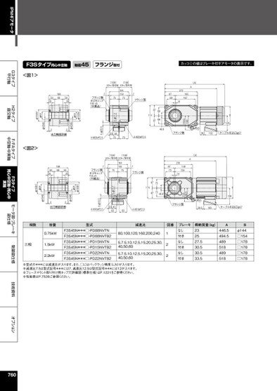 IPMギアモータG3タイプ平行軸H2タイプ直交軸F/FAタイプ中空軸・中実軸F3タイプ同心中空軸・同心中実軸モータ部・ブレーキ部仕様制御部仕様技術資料オプションF3Sタイプ同心中空軸軸径45フランジ取付カッコ()の値はブレーキ付ギアモータの表示です。<図1>B128φ20103119.5フランジ面38102ケーブル引込口φ271748769698748.8(A)A876927218516714(108)(108)(ホゴキャップ取り付け時)(ホゴキャップ取り付け時)16415075757フランジ面734-M20xP2.54-φ17.22350737フランジ面ホゴキャップF3S-45(付属品)4-φ20.54-M20xP2.51686850265026φ100h7φ64φ45H822出力軸部詳細φ45H8φ64φ100h7B139φ2059.5102ケーブル引込口φ2798.5115フランジ面(A)A8773235141481348773174738748.84-φ13.716415075757フランジ面7フランジ面ホゴキャップF3S-45(付属品)234063634-M16xP2.04-φ16.54-M16xP2.0(108)(108)(ホゴキャップ取り付け時)ホゴキャップ取り付け時)1686850265026φ100h7φ64φ45H822出力軸部詳細φ45H8φ64φ100h7<図2>相数容量型式減速比図番0.75kW三相1.5kW2.2kWF3S45N***□-PD08NVTNF3S45N***□-PD08NVTB2F3S45N***□-PD15NVTNF3S45N***□-PD15NVTB2F3S45N***□-PD22NVTNF3S45N***□-PD22NVTB280,100,120,160,200,2405,7.5,10,12.5,15,20,25,30,40,50,605,7.5,10,12.5,15,20,25,30,40,50,60122ブレーキなし付きなし付きなし付き概略質量(kg)232527.530.530.533.5A446.5494.5489518489518Bφ144□154□178□178□178□178※型式の***には減速比が入ります。また、□にはバックラッシ精度(L,N)が入ります。※減速比7.5は型式記号***には7、減速比12.5は型式記号***には12が入ります。※フェースマウント取り付け用タップ穴詳細図(標準仕様)はP.1221をご参照ください。※性能表はP.753をご参照ください。760