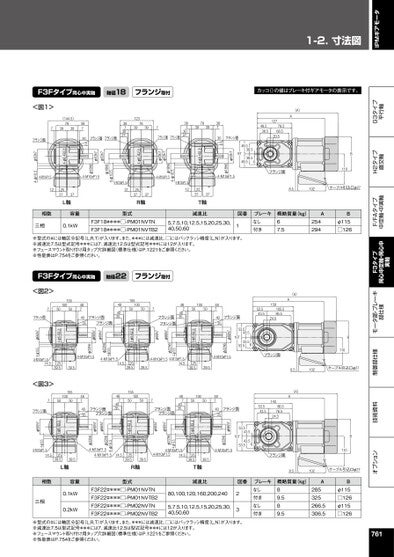 1-2.⼨法図IPMギアモータオプション技術資料制御部仕様モータ部・ブレーキ部仕様F3タイプ同心中空軸・同心中実軸F/FAタイプ中空軸・中実軸H2タイプ直交軸G3タイプ平行軸F3Fタイプ同心中実軸軸径18フランジ取付カッコ()の値はブレーキ付ギアモータの表示です。(A)A48.538.512778.568.520.56フランジ面B1108.5102ケーブル引込口φ27ブレーキなし付き概略質量(kg)67.5A254294Bφ115□1269748.548.538.538.5φ53h7φ18h64-M10xP1.54-φ8.4以上フランジ面30278737839393873027フランジ面フランジ面φ53h7φ53h74-φ10.5φ18h64-M10xP1.54-M10xP1.512253737T軸減速比図番12378393974-φ8.4以上4-M10xP1.12253737R軸型式φ53h7φ53h74-φ10.5φ18h6φ18h64-M10xP1.53873027フランジ面フランジ面8733027F3F18#***□-PM01NVTNF3F18#***□-PM01NVTB25,7.5,10,12.5,15,20,25,30,40,50,601<図1>(144.5)78739394-φ8.4以上4-M10xP1.5φ53h74-φ10.5フランジ面12253737L軸相数容量三相0.1kW※型式の#には軸区分記号(L,R,T)が入ります。また、***には減速比、□にはバックラッシ精度(L,N)が入ります。※減速比7.5は型式記号***には7、減速比12.5は型式記号***には12が入ります。※フェースマウント取り付け用タップ穴詳細図(標準仕様)はP.1221をご参照ください。※性能表はP.754をご参照ください。F3Fタイプ同心中実軸軸径22フランジ取付4874035フランジ面フランジ面φ66h7φ66h748740354-M10xP1.514.54-φ10.5φ22h6φ22h64-M10xP1.54874035フランジ面フランジ面φ66h7φ66h787440354-φ10.5φ22h64-M10xP1.5φ22h610015550<図2>750フランジ面4-φ8.4以上φ66h74-φ10.54-M10xP1.514.52539.539.510015550<図3>4-φ8.4以上750フランジ面φ66h74-φ10.54-M10xP1.58.5102ケーブル引込口φ27B110(A)A53.543.5159105.595.524.5フランジ面53.543.510743.553.56φ66h7φ22h64-M10xP1.54874035フランジ面100505048740354-φ8.4以上4-φ10.5φ22h6フランジ面フランジ面φ66h7φ66h7507155100504-φ8.4以上4-M10xP1.54-M10xP1.514.52539.539.52539.539.5フランジ面B11053.543.510743.553.56φ66h7φ22h64-M10xP1.54-φ8.4以上(A)A53.543.514086.576.524.5フランジ面8744035100505048740354-M10xP1.54-φ10.5φ22h64-M10xP1.5フランジ面フランジ面φ66h7φ66h7507155100504-φ8.4以上14.52539.539.5L軸4-M10xP1.514.52539.539.5R軸相数容量型式14.52539.539.5T軸減速比三相0.1kW0.2kWF3F22#***□-PM01NVTNF3F22#***□-PM01NVTB2F3F22#***□-PM02NVTNF3F22#***□-PM02NVTB280,100,120,160,200,2405,7.5,10,12.5,15,20,25,30,40,50,608.5102ケーブル引込口φ27図番23ブレーキなし付きなし付き概略質量(kg)89.589.5A285325266.5306.5Bφ115□126φ115□126※型式の#には軸区分記号(L,R,T)が入ります。また、***には減速比、□にはバックラッシ精度(L,N)が入ります。※減速比7.5は型式記号***には7、減速比12.5は型式記号***には12が入ります。※フェースマウント取り付け用タップ穴詳細図(標準仕様)はP.1221をご参照ください。※性能表はP.754をご参照ください。761