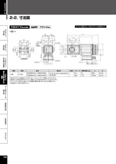 G3タイプ平行軸H2タイプ直交軸F/FAタイプ中空軸・中実軸F3タイプ同心中空軸・同心中実軸モータ部・ブレーキ部仕様制御部仕様技術資料オプションIPMギアモータ2-2.⼨法図F3Sタイプ同心中空軸軸径20フランジ取付カッコ()の値はブレーキ付ギアモータの表示です。(64)(64)(ホゴキャップ取り付け時)ホゴキャップ取り付け時)(A)A927839397フランジ面48.538.512778.568.569748.538.538.548.522.8フランジ面B108.24-φ8.4以上4-φ10.5φ53h7φ29φ29φ53h7φ20H822φ20H8出力軸部詳細<図1>2496481324137フランジ面ホゴキャップF3S-20(付属品)4-M10xP1.5122537374-M10xP1.59□10535適合コード径φ8~φ12相数容量型式減速比図番三相0.1kWF3S20N***□-VM01NVENF3S20N***□-VM01NVEV25,7.5,10,12.5,15,20,25,30,40,50,601ブレーキなし付き概略質量(kg)67.5A255316.5Bφ115φ115※型式の***には減速比が入ります。また、□にはバックラッシ精度(L,N)が入ります。※減速比7.5は型式記号***には7、減速比12.5は型式記号***には12が入ります。※フェースマウント取り付け用タップ穴詳細図(標準仕様)はP.1221をご参照ください。※性能表はP.766をご参照ください。768
