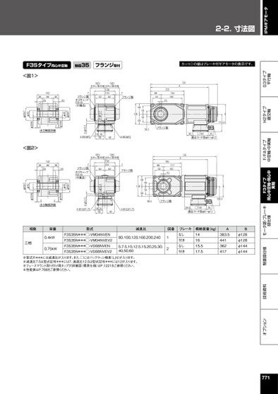 2-2.⼨法図オプション技術資料制御部仕様モータ部・ブレーキ部仕様F3タイプ同心中空軸・同心中実軸F/FAタイプ中空軸・中実軸H2タイプ直交軸G3タイプ平行軸IPMギアモータF3Sタイプ同心中空軸軸径35フランジ取付カッコ()の値はブレーキ付ギアモータの表示です。□10535適合コード径φ8~φ1238(A)AB115.2B126.2(A)A685422215414010136686854544-φ13.713812462627フランジ面(95)(95)(ホゴキャップ取り付け時)ホゴキャップ取り付け時)フランジ面38.3184058584-M16xP24-φ16.54-M16xP2<図1>38142662038207フランジ面ホゴキャップF3S-35(付属品)φ85h7φ49φ49φ85h7φ35H822出力軸部詳細φ35H8<図2>1366868565638.3フランジ面38.5□10535適合コード径φ8~φ124-M12xP1.75183048484-M12xP1.754-φ10.44-φ12.5φ85h7φ49φ35H822出力軸部詳細φ35H8φ49φ85h714266382038207フランジ面ホゴキャップF3S-35(付属品)(95)(95)(ホゴキャップ取り付け時)ホゴキャップ取り付け時)13812462627フランジ面685618510117105相数容量型式減速比図番三相0.4kW0.75kWF3S35N***□-VM04NVENF3S35N***□-VM04NVEV2F3S35N***□-VD08NVENF3S35N***□-VD08NVEV280,100,120,160,200,2405,7.5,10,12.5,15,20,25,30,40,50,6012ブレーキなし付きなし付き概略質量(kg)141615.517.5A383.5441362417Bφ128φ128φ144φ144※型式の***には減速比が入ります。また、□にはバックラッシ精度(L,N)が入ります。※減速比7.5は型式記号***には7、減速比12.5は型式記号***には12が入ります。※フェースマウント取り付け用タップ穴詳細図(標準仕様)はP.1221をご参照ください。※性能表はP.766をご参照ください。771