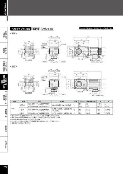 G3タイプ平行軸H2タイプ直交軸F/FAタイプ中空軸・中実軸F3タイプ同心中空軸・同心中実軸モータ部・ブレーキ部仕様制御部仕様技術資料オプションIPMギアモータF3Sタイプ同心中空軸軸径45フランジ取付カッコ()の値はブレーキ付ギアモータの表示です。17487696987119.510348.8フランジ面B126.2φ2038.5□10535適合コード径φ8~φ12734-M20xP2.54-φ17.22350734-φ20.54-M20xP2.5φ100h7φ64φ45H822出力軸部詳細φ45H8φ64φ100h7(108)(108)(ホゴキャップ取り付け時)(ホゴキャップ取り付け時)16868502650267フランジ面ホゴキャップF3S-45(付属品)16415075757フランジ面(A)A876927218516714<図1><図2>1748787737348.8A87732351414813498.5115フランジ面B137.2φ2060□10535適合コード径φ8~φ12(108)(108)(ホゴキャップ取り付け時)(ホゴキャップ取り付け時)16868502650267フランジ面ホゴキャップF3S-45(付属品)16415075757フランジ面634-M16xP2.04-φ13.72340634-φ16.54-M16xP2.0φ100h7φ64φ45H822出力軸部詳細φ45H8φ64φ100h7相数容量型式減速比図番三相0.75kW1.5kW2.2kWF3S45N***□-VD08NVENF3S45N***□-VD08NVEV2F3S45N***□-VD15NVENF3S45N***□-VD22NVEN80,100,120,160,200,2405,7.5,10,12.5,15,20,25,30,40,50,605,7.5,10,12.5,15,20,25,30122ブレーキなし付き概略質量(kg)2325A446.5501.5なしなし27.530.5489489Bφ144φ144□178□178※型式の***には減速比が入ります。また、□にはバックラッシ精度(L,N)が入ります。※減速比7.5は型式記号***には7、減速比12.5は型式記号***には12が入ります。※モータ容量1.5kW・2.2kWブレーキ付はありません。※フェースマウント取り付け用タップ穴詳細図(標準仕様)はP.1221をご参照ください。※性能表はP.767をご参照ください。772