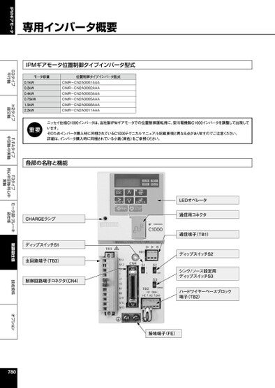 IPMギアモータG3タイプ平行軸H2タイプ直交軸F/FAタイプ中空軸・中実軸F3タイプ同心中空軸・同心中実軸モータ部・ブレーキ部仕様制御部仕様技術資料オプション専用インバータ概要IPMギアモータ位置制御タイプインバータ型式モータ容量位置制御タイプインバータ型式0.1kW0.2kW0.4kW0.75kW1.5kW2.2kWCIMR-CN2A0001AAACIMR-CN2A0002AAACIMR-CN2A0003AAACIMR-CN2A0005AAACIMR-CN2A0008AAACIMR-CN2A0011AAA重要ニッセイ仕様C1000インバータは、当社製IPMギアモータでの位置制御運転用に、安川電機製C1000インバータを調整して出荷しています。そのためインバータ購入時に同梱されているC1000テクニカルマニュアル記載事項と異なる点がありますのでご注意ください。詳細は、インバータ購入時に同梱されている小紙(黄色)をご参照ください。各部の名称と機能CHARGEランプディップスイッチS1主回路端子(TB3)制御回路端子コネクタ(CN4)780LEDオペレータ通信用コネクタ通信端子(TB1)ディップスイッチS2シンク/ソース設定用ディップスイッチS3ハードワイヤーベースブロック端子(TB2)接地端子(FE)