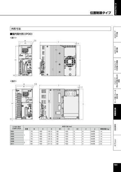 IPMギアモータオプション技術資料制御部仕様モータ部・ブレーキ部仕様F3タイプ同心中空軸・同心中実軸F/FAタイプ中空軸・中実軸H2タイプ直交軸G3タイプ平行軸外形寸法■盤内取付形(IP00)<図1>WW13-dWW14-dH1H2<図2>H1H2DDt1Ht1HC1000型式CIMR-CN2A図番WH00010002000300050008001170707070909012160160160160160160D191.5191.5191.5191.5211.5211.5585858588080外形寸法(mm)W1H1H2t1150150150150150150555555444444dM4用M4用M4用M4用M4用M4用概略質量(kg)1.41.41.41.42.52.5781