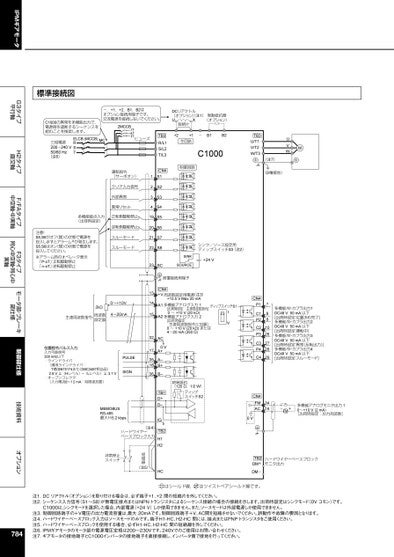 IPMギアモータG3タイプ平行軸H2タイプ直交軸F/FAタイプ中空軸・中実軸F3タイプ同心中空軸・同心中実軸モータ部・ブレーキ部仕様制御部仕様技術資料オプション多機能ホトカプラ出力1DC48V50mA以下[出荷時設定:位置決め完了]多機能ホトカプラ出力2DC48V50mA以下[出荷時設定:運転中]多機能ホトカプラ出力3DC48V50mA以下[出荷時設定:異常(反転出力)]多機能ホトカプラ出力4DC48V50mA以下[出荷時設定:スルーモード]7891026272829CN4P1C1P2C2P3C3P4C419S520S621S722S823SCシンク/ソース設定用ディップスイッチS3(注2)SINKSOURCE+24V被覆接続用端子(注3)周波数設定用電源+10.5VMax20mA多機能アナログ入力1[出荷時設定:主速周波数指令]0~+10V(20kΩ)多機能アナログ入力2[出荷時設定:主速周波数指令に加算]0~+10V(20kΩ)または4~20mA(250Ω)ディップスイッチS1IVMUVWTB3U/T1V/T23W/T(注7)(D種接地)+21+主回路-B1B2C1000制御回路TB3R/L1S/L2T/L3CN41SS2S3S41234-,+1,+2,B1,B2はオプション接続用端子です。交流電源を接続しないでください。DCリアクトル(注1)(オプションXU短絡片制動抵抗器(オプション)2MCCBr1s1t1ヒューズ終端抵抗(120Ω,1/2W)ディップスイッチS2CN4FMAC34160V+-FM多機能アナログモニタ出力10~+10V(2mA)[出荷時設定:出力周波数]ハードワイヤーベースブロックモニタ出力TB2+DMDM-はシールド線,はツイストペアシールド線です。注1.DCリアクトル(オプション)を取り付ける場合は、必ず端子+1、+2間の短絡片を外してください。注2.シーケンス入力信号(S1〜S8)が無電圧接点またはNPNトランジスタによるシーケンス接続の場合の接続を示します。出荷時設定はシンクモード(0Vコモン)です。C1000は,シンクモードを選択した場合、内部電源(+24V)しか使用できません。また,ソースモードは外部電源しか使用できません。注3.制御回路端子の+V電圧の出力電流容量は,最大20mAです。制御回路端子+V、AC間を短絡させないでください。誤動作や故障の要因となります。注4.ハードワイヤーベースブロック入力はソースモードのみです。端子H1-HC、H2-HC間には、接点またはPNPトランジスタをご使用ください。注5.ハードワイヤーベースブロックを使用する場合、必ずH1-HC、H2-HC間の短絡線を外してください。注6.IPMギアモータのモータ部の電源電圧定格は200〜230Vです。240Vでのご使用はお問い合わせください。注7.ギアモータの接地端子とC1000インバータの接地端子を直接接続し、インバータ側で接地を行ってください。784運転指令(サーボオン)クリア入力信号外部異常異常リセット正転側駆動禁止逆転側駆動禁止スルーモードスルーモード標準接続図C1000の異常を多機能出力で,電源側を遮断するシーケンスを組むことを推奨します。MCELCB(MCCB)RTS三相電源200~240V50/60Hz(注6)多機能接点入力(出荷時設定)注意!S5,S6がオフ(開)の状態で電源を投入しますとアラーム※が発生します。S5,S6はオン(閉)の状態で電源を投入してください。※アラーム時のオペレータ表示「P-oT」:正転駆動禁止「n-oT」:逆転駆動禁止CN4+VA1A2AC0VA+A–B+B–TB1+–DDIGTB2H1H2HCMEMOBUSRS-485最大115.2kbps(注4)ハードワイヤーベースブロック入力短絡線(注5)非常停止スイッチ0~+10V4~20mA2kΩ周波数設定器主速周波数指令位置指令パルス入力入力可能信号300kHz以下・ラインドライバ(適用ラインドライバ:TI製SN75174またはMC3487相当品)2.8V≦(Hレベル)–(Lレベル)≦3.7V・オープンコレクタ(入力電流8~12mA:制限抵抗要)PULSESIGN1314153217351836