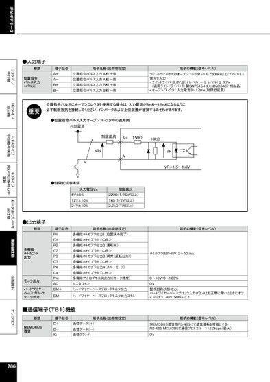 IPMギアモータG3タイプ平行軸H2タイプ直交軸F/FAタイプ中空軸・中実軸F3タイプ同心中空軸・同心中実軸モータ部・ブレーキ部仕様制御部仕様技術資料オプション●入力端子種類位置指令パルス入力(パルス)端子記号A+A-B+B-端子名称(出荷時設定)端子の機能(信号レベル)位置指令パルス入力A相+側位置指令パルス入力A相-側位置指令パルス入力B相+側位置指令パルス入力B相-側ラインドライバまたはオープンコレクタレベルで300kHz以下のパルス信号を入力•ラインドライバ:2.8V≦(Hレベル)-(Lレベル)≦3.7V(適用ラインドライバ:TI製SN75154またはMC3487相当品)•オープンコレクタ:入力電流8〜12mA(制限抵抗要)位置指令パルスにオープンコレクタを使用する場合は、入力電流が8mA~12mAになるように必ず制限抵抗を接続してください。インバータおよび上位装置が破損するおそれがあります。重要●位置指令パルス入力オープンコレクタ時の適用例外部電源制限抵抗A+150Ω10kΩVINA-VFVF=1.5~1.8V●制限抵抗参考値入力電圧VIN制限抵抗5V±5%12V±10%24V±10%220Ω(1/10W以上)1kΩ(1/2W以上)2.2kΩ(1W以上)●出力端子種類多機能ホトカプラ出力モニタ出力ハードワイヤーベースブロックモニタ出力端子記号P1C1P2C2P3C3P4C4FMACDM+端子名称(出荷時設定)多機能ホトカプラ出力1(位置決め完了)多機能ホトカプラ出力コモン多機能ホトカプラ出力2(運転中)多機能ホトカプラ出力コモン多機能ホトカプラ出力3(異常(反転出力))多機能ホトカプラ出力コモン多機能ホトカプラ出力4(スルーモード)多機能ホトカプラ出力コモン多機能アナログモニタ出力1(モータ速度)モニタコモンハードワイヤーベースブロックモニタ出力DM-ハードワイヤーベースブロックモニタ出力コモン■通信端子(TB1)機能端子の機能(信号レベル)ホトカプラ出力48V、2〜50mA0〜10V/0〜100%0V監視回路状態出力。ハードワイヤーベースブロック入力が2点とも正常に働いたときにオフになります。48V、50mA以下種類MEMOBUS通信端子記号D+D-IG端子名称(出荷時設定)端子の機能(信号レベル)通信データ(+)通信データ(-)通信グランドMEMOBUS通信用RS-485にて通信運転を可能とするRS-485MEMOBUS通信プロトコル115.2kbps最大)0V786