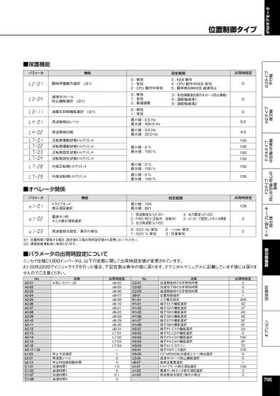 IPMギアモータオプション技術資料制御部仕様モータ部・ブレーキ部仕様F3タイプ同心中空軸・同心中実軸F/FAタイプ中空軸・中実軸H2タイプ直交軸G3タイプ平行軸設定範囲出荷時設定0:無効1:有効2:CPU動作中有効3:KEB動作4:CPU動作中KEB有効5:瞬停検出時KEB減速停止3:有効(制動抵抗器付きストール防止機能)4:過励磁減速15:過励磁減速20:無効1:有効2:最適調整0:無効1:有効最小値:0.0Hz最大値:400.0Hz最小値:0.0Hz最大値:20.0Hz最小値:0%最大値:150%最小値:0%最大値:150%最小値:0%最大値:150%0000.04.0150150150150150150出荷時設定10932■保護機能パラメータ機能瞬時停電動作選択(注1)減速中ストール防止機能選択(注1)過電圧抑制機能選択(注1)周波数検出レベル周波数検出幅正転側電動状態トルクリミット逆転側電動状態トルクリミット正転側回生状態トルクリミット逆転側回生状態トルクリミット外部正転側トルクリミット外部逆転側トルクリミット■オペレータ関係パラメータ機能ドライブモード表示項目選択電源オン時モニタ表示項目選択設定範囲最小値:104最大値:6211:周波数指令(U1-01)2:FWD/REV(正転中/逆転中)3:出力周波数(U1-02)4:出力電流(U1-03)5:o1-01で設定したモニタ項目周波数指令設定/表示の単位0:0.01Hz単位1:0.01%単位2:r/min単位3:任意単位注1.位置制御で運転する場合、設定値を工場出荷時設定値から変更しないでください。注2.速度制御運転時に有効となります。■パラメータの出荷時設定についてニッセイ仕様C1000インバータは、以下の定数に関して出荷時設定値が変更されています。A1-03を2220でイニシャライズを行った場合、下記定数は表中の値に戻ります。テクニカルマニュアルに記載しています値には戻りませんのでご注意ください。No.A2-01A2-02A2-03A2-04A2-05A2-06A2-07A2-08A2-09A2-10A2-11A2-12A2-13A2-14A2-15A2-16A2-17~32b1-03b2-01b2-13C1-01C1-02C1-07C1-08名称お気に入り1〜32停止方法選択零速度レベル停止時短絡制動時間加速時間1減速時間1加速時間4減速時間4出荷時設定d9-02d9-05d9-06d9-07d9-08d9-10d9-21d9-22d9-28d9-29d9-30d9-31L7-01L7-02L7-03L7-04—1001.50.150No.C2-01C2-02C2-03d9-01E1-01H1-01H1-02H1-05H1-06H1-07H1-08H2-01H2-02H2-03H2-04H3-03H4-01H5-05L3-04n8-57o1-01o1-02o1-03名称加速開始時のS字特性時間加速完了時のS字特性時間減速開始時のS字特性時間位置制御選択入力電圧設定端子S1の機能選択端子S2の機能選択端子S5の機能選択端子S6の機能選択端子S7の機能選択端子S8の機能選択端子P1-C1の機能選択端子P2-C2の機能選択端子P3-C3の機能選択端子P4-C4の機能選択端子A1入力ゲイン端子FMモニタ選択CE(MEMOBUS通信エラー)検出選択減速中ストール防止機能選択高周波重畳選択ドライブモード表示項目選択電源オン時モニタ表示項目選択周波数指令設定/表示の単位出荷時設定000120042374D4E0F0F2A010E0F7210500132109795