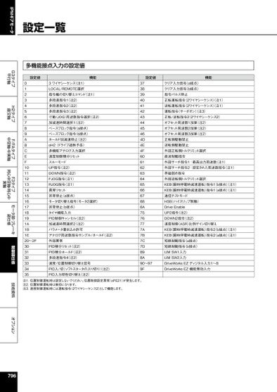 IPMギアモータG3タイプ平行軸H2タイプ直交軸F/FAタイプ中空軸・中実軸F3タイプ同心中空軸・同心中実軸モータ部・ブレーキ部仕様制御部仕様技術資料オプション設定一覧多機能接点入力の設定値設定値機能設定値機能0123456789ABCEF101112131415161718191A1B1E20〜2F3031323334353ワイヤシーケンス(注1)LOCAL/REMOTE選択指令権の切り替えコマンド(注1)多段速指令1(注2)多段速指令2(注2)多段速指令3(注2)寸動(JOG)周波数指令選択(注2)加減速時間選択1(注2)ベースブロック指令(a接点)ベースブロック指令(b接点)ホールド加減速停止(注2)oH2(ドライブ過熱予告)多機能アナログ入力選択速度制御積分リセットスルーモードUP指令(注2)DOWN指令(注2)FJOG指令(注1)RJOG指令(注1)異常リセット非常停止(a接点)モータ切り替え指令(モータ2選択)非常停止(b接点)タイマ機能入力PID制御キャンセル(注2)加減速時間選択2(注2)パラメータ書き込み許可アナログ周波数指令サンプル/ホールド(注2)外部異常PID積分リセット(注2)PID積分ホールド(注2)多段速指令4(注2)速度/位置制御切り替え信号PID入/切(ソフトスタータの入り切り)注2)PID入力特性切り替え(注2)373839404142434445464D4E4F6061626364656667686A7576777A7B7C7D898A90〜979Fクリア入力信号(a接点)クリア入力信号(b接点)指令パルス停止正転運転指令(2ワイヤシーケンス)注1)逆転運転指令(2ワイヤシーケンス)注1)運転指令(サーボオン)注3)正転/逆転指令2(2ワイヤシーケンス2)オフセット周波数1加算(注2)オフセット周波数2加算(注2)オフセット周波数3加算(注2)正転側駆動禁止逆転側駆動禁止外部正転側トルクリミット選択直流制動指令外部サーチ指令1:最高出力周波数(注1)外部サーチ指令2:設定された周波数指令(注1)界磁弱め指令外部逆転側トルクリミット選択KEB(瞬時停電時減速運転)指令1b接点)(注1)KEB(瞬時停電時減速運転)指令1(a接点)(注1)通信テストモードHSB(ハイスリップ制動)DriveEnableUP2指令(注2)DOWN2指令(注2)速度制御(ASR)比例ゲイン切り替えKEB(瞬時停電時減速運転)指令2b接点)(注1)KEB(瞬時停電時減速運転)指令2a接点)(注1)短絡制動指令(a接点)短絡制動指令(b接点)LIMSW1入力LIMSW2入力DriveWorksEZディジタル入力1〜8DriveWorksEZ機能無効入力注1.位置制御運転時は設定しないでください。位置制御設定異常(oPE21)が発生します。注2.位置制御運転時は無効になります。注3.速度制御運転時には運転指令(2ワイヤシーケンス2)として機能します。796
