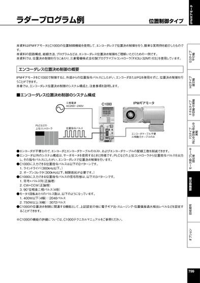 IPMギアモータオプション技術資料制御部仕様モータ部・ブレーキ部仕様F3タイプ同心中空軸・同心中実軸F/FAタイプ中空軸・中実軸H2タイプ直交軸G3タイプ平行軸ラダープログラム例本資料はIPMギアモータとC1000の位置制御機能を使用して、エンコーダレスで位置決め制御を行う、簡単な実用例を紹介したものです。本資料の回路構成、結線方法、プログラムなどは、エンコーダレス位置決め制御をご理解いただくための一例です。本資料では、位置決め制御を行うにあたり、三菱電機株式会社製プログラマブルコントローラ「FX3U-32MT/ES」を使用しています。エンコーダレス位置決め制御の概要IPMギアモータをC1000で制御すると、外部からの位置指令パルスにしたがい、エンコーダまたはPGを使用せずに、位置決め制御を行うことができます。本章では、エンコーダレス位置決め制御のシステム構成と、注意事項を説明します。■エンコーダレス位置決め制御のシステム構成三相電源AC200~240VC1000IPMギアモータPLCなどの上位コントローラ位置指令パルスエンコーダケーブル不要三相動力ケーブルのみ●エンコーダが不要なので、エンコーダとエンコーダケーブルのコスト、およびエンコーダケーブルの配線工数を削減できます。●エンコーダ以外のシステム構成は、サーボモータを使用するときと同様です。PLCなどの上位コントローラから位置指令パルスを出力し、その指令パルスにしたがい、エンコーダレスで位置決め制御を行います。●C1000に入力できる位置指令パルスは以下の2パターンです。1.ラインドライバ(300kHz以下。)2.オープンコレクタ(300kHz以下。制限抵抗が必要です。)●C1000に入力できる位置指令パルスの信号形態は、以下の3パターンです。1.符号+パルス列(正論理)2.CW+CCW(正論理)3.90°位相差二相パルス(4倍)●モータ1回転あたりのパルス数は、以下のようになっています。1.400W以下(4極):2048パルス2.750W以上(6極):3072パルス●C1000の位置決め制御に関連する機能として、上記設定の他に電子ギア比・スムージング・位置偏差過大検出レベルなどを設定することができます。※C1000の機能の詳細については、C1000テクニカルマニュアルをご参照ください。799