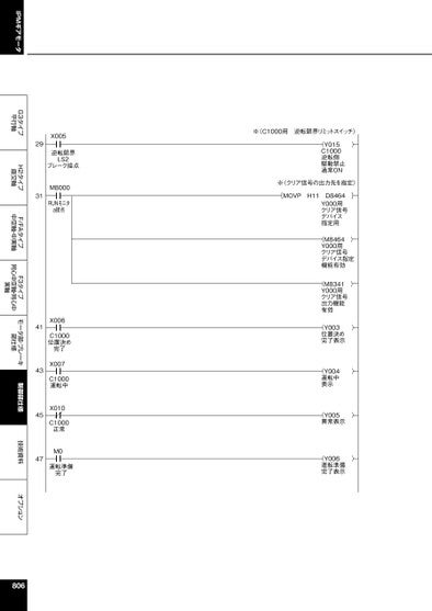 IPMギアモータG3タイプ平行軸H2タイプ直交軸F/FAタイプ中空軸・中実軸F3タイプ同心中空軸・同心中実軸モータ部・ブレーキ部仕様制御部仕様技術資料オプション※〈C1000用逆転限界リミットスイッチ〉(Y015)C1000逆転側駆動禁止通常ON※〈クリア信号の出力先を指定〉[MOVPH11D8464]Y000用クリア信号デバイス指定用(M8464)Y000用クリア信号デバイス指定機能有効(M8341)Y000用クリア信号出力機能有効(Y003)位置決め完了表示(Y004)運転中表示(Y005)異常表示(Y006)運転準備完了表示X00529逆転限界LS2ブレーク接点31M8000RUNモニタa接点41434547X006C1000位置決め完了X007C1000運転中X010C1000正常M0運転準備完了806