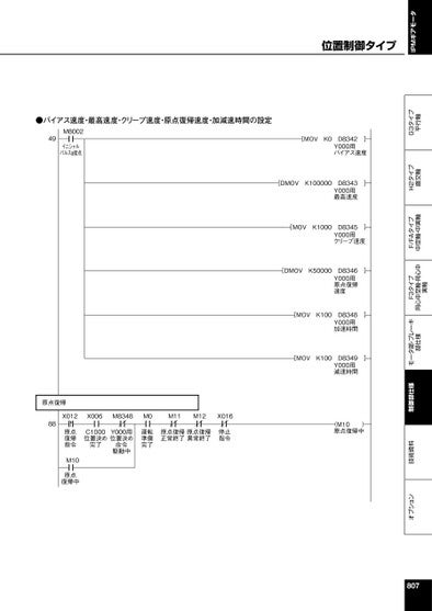 IPMギアモータオプション技術資料制御部仕様モータ部・ブレーキ部仕様F3タイプ同心中空軸・同心中実軸F/FAタイプ中空軸・中実軸H2タイプ直交軸G3タイプ平行軸●バイアス速度・最高速度・クリープ速度・原点復帰速度・加減速時間の設定49M8002イニシャルパルスa接点[MOVK0D8342]Y000用バイアス速度[DMOVK100000D8343]Y000用最高速度[MOVK1000D8345]Y000用クリープ速度[DMOVK50000D8346]Y000用原点復帰速度[MOVK100D8348]Y000用加速時間[MOVK100D8349]Y000用減速時間原点復帰88X012X006M8348M0M11M12X016Y000用位置決め命令駆動中原点復帰指令C1000位置決め完了M10原点復帰中運転準備完了原点復帰正常終了原点復帰異常終了停止指令(M10)原点復帰中807