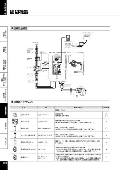 IPMギアモータG3タイプ平行軸H2タイプ直交軸F/FAタイプ中空軸・中実軸F3タイプ同心中空軸・同心中実軸モータ部・ブレーキ部仕様制御部仕様技術資料オプション周辺機器周辺機器接続図電源LCDオペレータUSB付きコピーユニットUSBケーブル(ABタイプ)エンジニアリングツールDriveWizardDrieWorksEZパソコン配線用遮断器(MCCB)または漏電ブレーカ電磁接触器(MC)ACリアクトル零相リアクトルヒューズ入力側(一次側)ノイズフィルタ周辺機器とオプションサージアブソーバ+2+1DCリアクトル瞬時停電補償ユニットC1000B1B2サーマルリレー制動抵抗器または制動抵抗器ユニット接地R/L1S/L2T/L3U/T1V/T2W/T3出力側(二次側)ノイズフィルタギアモータ零相リアクトル接地名称形式機能・目的などDCリアクトルUZDAシリーズ主回路オプション高調波抑制電源総合力率の改善ACリアクトルUZBAシリーズ電源容量が大きい場合はC1000の保護(電源容量が600kWAを超える場合には必ずご使用ください。)制動抵抗器ERF-150WJシリーズ電気ブレーキを必要とする場合(利用率(%ED)が3%を超える場合は、容量アップが必要です。)ヒューズ付制動抵抗器CF120-B579シリーズ電気ブレーキを必要とする場合(利用率(%ED)が3%を超える場合は、容量アップが必要です。)制動抵抗器ユニットLKEBシリーズ電気ブレーキを必要とする場合は、利用率(%ED)が10%を超えないようにしてください。配線用遮断器(MCCB)NFシリーズ漏電ブレーカNV、EGまたはSGシリーズ810短絡事故時の電源系統の保護や配線の過負荷保護(注)C1000の配線の保護と故障時の二次被害を防止するため、電源側に設置してください。上位電源系統で漏電遮断を許容される場合に使用できます。短絡事故時の電源系統の保護や配線の過負荷保護、および感電事故防止や漏電火災の誘引となる地絡保護(注)C1000の配線の保護と故障時の二次被害を防止するため、電源側に設置してください。上位電源系統で漏電遮断を許容される場合、配線用遮断器も使用できます。当社在庫○(注1)×○××××