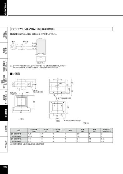 IPMギアモータG3タイプ平行軸H2タイプ直交軸F/FAタイプ中空軸・中実軸F3タイプ同心中空軸・同心中実軸モータ部・ブレーキ部仕様制御部仕様技術資料オプションDCリアクトル(UZDA-B形:直流回路用)電源容量が600kVAを超える場合には必ず設置してください。電源MCCBC1000R/L1S/L2T/L3+1+2DCリアクトル注1.DCリアクトルを接続する前に、必ずC1000の端子+1と+2間の短絡片を取り外してください。DCリアクトルを接続しない場合は、端子+1、+2間の短絡片は外さないでください。■寸法図3260接続リード(1.25m㎡)2-取付穴(M4ネジ取付用)銘板537485<図1>銘板365518802-端子(M5ネジ取付用)UX766086<図2>4-取付穴(M4ネジ取付用)単位:mm型式OP-XX010048OP-XX010048OP-XX010049OP-XX010049モータ容量(kW)電流値(A)インダクタンス(mH)図番質量(kg)損失(W)0.40.751.52.25.45.41818883311220.80.822881818電線サイズ(mm2)注2)225.55.5注2.電線種類75℃IV線、周囲温度45℃、3本以内束線812