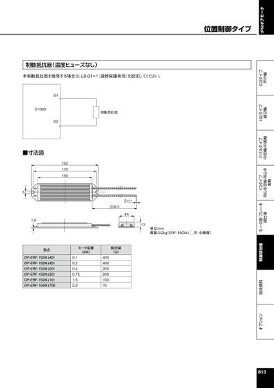IPMギアモータオプション技術資料制御部仕様モータ部・ブレーキ部仕様F3タイプ同心中空軸・同心中実軸F/FAタイプ中空軸・中実軸H2タイプ直交軸G3タイプ平行軸制動抵抗器(温度ヒューズなし)本制動抵抗器を使用する場合は、L8-01=1過熱保護有効)を設定してください。C1000B1B2制動抵抗器182170150■寸法図51.2250±55±0.54413単位:mm質量:0.2kgERF-150WJ形全機種)型式OP-ERF-150WJ401OP-ERF-150WJ401OP-ERF-150WJ201OP-ERF-150WJ201OP-ERF-150WJ101OP-ERF-150WJ700モータ容量(kW)抵抗値(Ω)0.10.20.40.751.52.240040020020010070813