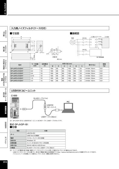 IPMギアモータG3タイプ平行軸H2タイプ直交軸F/FAタイプ中空軸・中実軸F3タイプ同心中空軸・同心中実軸モータ部・ブレーキ部仕様制御部仕様技術資料オプション入力側ノイズフィルタ(ケース付き)■寸法図WA■接続図電源MCCB入力側ノイズフィルタR/L1URC1000他の制御機器S/L2T/L3VWESTMCCB515φ121015詳細E図単位:mmHmax.CBDUVWERSTφ5Eφ30C型式OP-LNFD-2103HYOP-LNFD-2103HYOP-LNFD-2103HYOP-LNFD-2103HYOP-LNFD-2103HYOP-LNFD-2153HYモータ容量(kW)定格電流(A)0.10.20.40.751.52.2101010101015外形寸法(mm)W185185185185185185DH959595959595858585858585A155155155155155155BC656565656565333333333333取付けねじ4×M4、10mm4×M4、10mm4×M4、10mm4×M4、10mm4×M4、10mm4×M4、10mm質量(kg)0.90.90.90.90.90.9USB付きコピーユニットC1000RJ-45ケーブル(1m)PCUSB付きコピーユニット注1.OP-JVOP-181は、USB付きコピーユニット、RJ-45ケーブル、USBケーブルのセットです。USBケーブル(30cm)型式OP-JVOP-181■仕様項目仕様ポート電源対応OS記憶容量外形寸法付属品LAN(RJ-45)USB(Ver.2.0準拠)パソコン、インバータから供給Windows10インバータ1台分のパラメータを記憶30(W)×80(H)×20(D)mmRJ-45ケーブル(1m)、USBケーブル(30cm)注1.インバータの電源仕様、容量、制御モード、ソフトウェアバージョンが同一の場合のみパラメータの書き込みができます。USBドライバのインストールが必要です。(株)安川電機の製品・技術情報サイト(http://www.e-mechatronics.com)より無償でダウンロードできます。パソコンとインバータを接続している場合は、パラメータコピー機能は使用できません。814