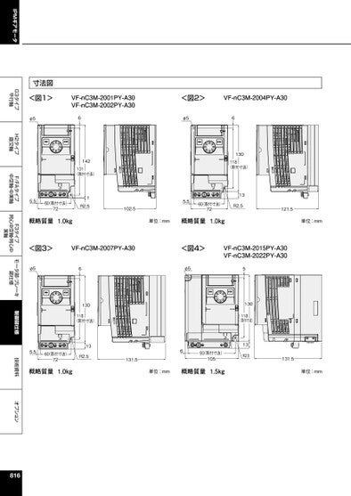 IPMギアモータG3タイプ平行軸H2タイプ直交軸F/FAタイプ中空軸・中実軸F3タイプ同心中空軸・同心中実軸モータ部・ブレーキ部仕様制御部仕様技術資料オプション寸法図<図1>VF-nC3M-2001PY-A30VF-nC3M-2002PY-A30<図2>VF-nC3M-2004PY-A30φ56φ56142131(取付寸法)130118(取付寸法)1R2.55.560取付寸法)72概略質量1.0kg102.55.560(取付寸法)7213R2.5単位:mm概略質量1.0kg121.5単位:mm<図3>VF-nC3M-2007PY-A30<図4>VF-nC3M-2015PY-A30VF-nC3M-2022PY-A30φ56φ55130118(取付寸法)13R2.55.560(取付寸法)72概略質量1.0kg130118(取付寸法)13R2.5131.5単位:mm131.5693取付寸法)105単位:mm概略質量1.5kg816