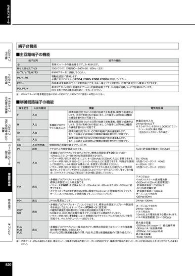 IPMギアモータG3タイプ平行軸H2タイプ直交軸F/FAタイプ中空軸・中実軸F3タイプ同心中空軸・同心中実軸モータ部・ブレーキ部仕様制御部仕様技術資料オプション端子台機能■主回路端子の機能端子記号R/L1、S/L2、T/L3U/T1、V/T2,W/T3PA/+、PBPC/-PO、PA/+端子の機能専用インバータの接地端子です。3ヶ所あります。200Vクラス:三相200〜240V-50/60Hz(注1)IPMギアモータに接続してください。制動抵抗器に接続します。必要に応じてパラメータF304、F305、F308、F309を設定してください。内部直流主回路のマイナス電位端子です。PA/+端子(プラス電位)との間で直流コモン電源入力できます。直流リアクトル(DCL:別置きオプション)の接続用端子です。出荷時は短絡バーにて短絡されています。DCLを取り付ける場合は短絡バーを外してください。注1.IPMギアモータの電源電圧定格は200〜230Vです。240Vでのご使用はお問合せください。■制御回路端子の機能端子記号入出力種別機能電気的仕様FRS1S2CCP5入力入力入力入力入出力共通出力VI入力FM出力P24出力OUTNOFLAFLBFLC出力出力多機能プログラマブル接点入力標準出荷設定ではF-CC間の短絡で正転運転、開放で減速停止します。STが常時ONの場合)また、この端子には同時に3種類の機能を割り付け可能です。標準出荷設定ではR-CC間の短絡で逆転運転、開放で減速停止します。STが常時ONの場合)また、この端子には同時に3種類の機能を割り付け可能です。標準出荷設定ではS1-CC間の短絡で多段速運転します。また、この端子には同時に2種類の機能を割り付け可能です。標準出荷設定ではS2-CC間の短絡で多段速運転します。また、この端子には同時に2種類の機能を割り付け可能です。制御回路の等電位端子です。2ヶ所)アナログ入力設定電源出力です。多機能プログラマブルアナログ入力です。標準出荷設定(F109=0)では0〜・10Vdc入力で、0〜60/90Hz周波数設定となります。・パラメータ切り替え(F109=1)により、4〜20mAdc0-20mA)入力に変更できます。・パラメータ切り替え(F109=3)により、0〜5Vdc入力に変更できます。P5端子を使用して外部ボリュームを接続する場合には、本設定に切り換えてください。・パラメータ切り替え(F109=2)で多機能プログラマブル接点入力端子として使用可能です。スライドスイッチSW1LOGIC)およびパラメータF127にて行います。その場合、スライドスイッチSW2(RESIST)をON側に設定してください。無電圧接点入力24Vdc・5mA以下※スライドスイッチSW1LOGIC)にてシンク・ソースを切り換え可能(左記はシンクロジックの場合)—5Vdc許容負荷電流:10mAdc)5V/10Vdc(内部インピーダンス:40kΩ)4〜20mA(注1)(内部インピーダンス:250Ω)・多機能プログラマブルアナログ出力です。標準出荷設定は出力周波数です。パラメータ(F681)を切換えると、0〜20mAdc(4〜20mA)または0〜10Vdcに変・更できます。・スライドスイッチSW3(FM)をOUT側に設定することによって多機能プログラマブルオープンコレクタ出力として使用可能です。(シンクロジックのみ)24Vdc電源出力です。・多機能プログラマブルオープンコレクタ出力です。標準出荷設定ではブレーキ開放信号を検出して出力します。パラメータF341=3に設定時)2種類の機能を同時割り付け可能な複合機能出力端子です。・・NO端子は、OUT用の等電位端子です。CC端子とは絶縁されています。パラメータ切り替え(F669)により、多機能プログラマブルパルス列出力として使用・可能です。パルスのデューティーは50%です。・多機能プログラマブルリレー接点出力です。標準出荷設定ではインバータの保護機能の動作を検出して出力します。FLA-FLC間は保護機能動作で閉、FLB-FLC間は保護機能動作で開の接点です。・アナログ出力・1mAフルスケール直流電流計・0-20mA(4-20mA)直流電流計許容負荷抵抗:750Ω以下・0-10V直流電圧計許容負荷抵抗:1kΩ以上オープンコレクタ出力・25Vdc-50mA24Vdc・100mAオープンコレクタ出力24Vdc・100mAパルス列出力10mA以上の電流を流す必要があります。パルス周波数範囲25〜1600pps最大接点容量・250Vac-2A(cosφ=1):抵抗負荷時・30Vdc-A:抵抗負荷時・250Vac-1A(cosφ=0.4)最小接点容量・5Vdc-100mA注1.VI端子:4〜20mA選択した場合、専用インバータ電源ON時は内部インピーダンス250Ωですが、電源OFF時は内部インピーダンスが約40kΩと大きくなりますので、ご注意ください。820