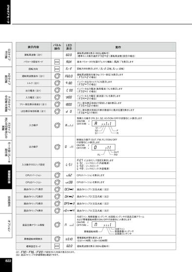 IPMギアモータG3タイプ平行軸H2タイプ直交軸F/FAタイプ中空軸・中実軸F3タイプ同心中空軸・同心中実軸モータ部・ブレーキ部仕様制御部仕様技術資料オプションパネル操作LED表示動作MODEMODE運転周波数を表示(60Hz運転中)(標準モニタ表示選択〔運転周波数〕設定の場合)基本パラメータの先頭の“ヒストリ機能()”を表示します回転方向を表示します。:正転、:逆転)運転周波数指令値(Hz/フリー単位)を表示します(の場合)インバータ出力トルク(%)を表示します(の場合)インバータ出力電流(負荷電流)%)を表示します(の場合)インバータ入力電圧(直流部)(%)を表示します(の場合)フリー単位表示倍率2で設定した値を表示します(の場合)フリー単位表示倍率2の表示数値の小数点位置を表示します(の場合)制御入力端子(FR、S1、S2、VI)のON/OFFの状態をビット表示しますONの時:OFFの時:FRVIS2S1制御出力端子(OUT、FM、FL)のON/OFFの状態をビット表示しますONの時:OFFの時:FLOUTFMによるロジック設定を表示します:シンクロジック(内部電源):ソースロジック:シンクロジック(外部電源)CPU1バージョンを表示しますCPU2バージョンを表示します過去のトリップ1交互点滅)(注2)過去のトリップ2交互点滅)(注2)過去のトリップ3交互点滅)(注2)過去のトリップ4交互点滅)(注2)冷却ファン、制御基盤コンデンサ、主回路コンデンサの部品交換アラームおよび累積運転時間のON/OFFの状態をビット表示しますONの時:OFFの時:累積運転時間累積運転時間を表示します(0.01=1時間、1.00=100時間)冷却ファン制御基盤コンデンサ主回路コンデンサ表示内容運転周波数(注1)パラメータ設定モード回転方向運転周波数指令(注1)トルク(注1)出力電流(注1)入力電圧(注1)フリー単位表示倍率2(注1)LED表示有効桁数(注1)入力端子出力端子入力端子のロジック設定CPU1バージョンCPU2バージョン過去のトリップ1表示過去のトリップ2表示過去のトリップ3表示過去のトリップ4表示部品交換アラーム情報累積運転時間表示標準設定モードMODE運転周波数を表示(60Hz運転中)注1.注2.過去のトリップの詳細情報も確認できます。)で設定された内容が表示されます。〜、822