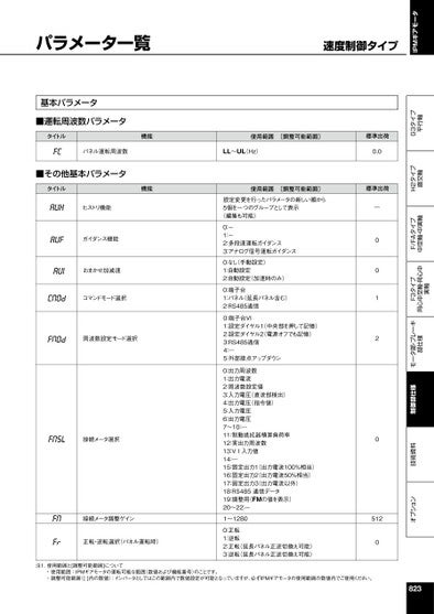 IPMギアモータオプション技術資料制御部仕様モータ部・ブレーキ部仕様F3タイプ同心中空軸・同心中実軸F/FAタイプ中空軸・中実軸H2タイプ直交軸G3タイプ平行軸パラメータ一覧基本パラメータ■運転周波数パラメータタイトルパネル運転周波数■その他基本パラメータタイトル機能機能ヒストリ機能ガイダンス機能おまかせ加減速コマンドモード選択周波数設定モード選択接続メータ選択使用範囲〔調整可能範囲〕LL~UL(Hz)使用範囲〔調整可能範囲〕設定変更を行ったパラメータの新しい順から5個を一つのグループとして表示(編集も可能)0123:-:-:多段速運転ガイダンス:アナログ信号運転ガイダンス012:なし(手動設定):自動設定:自動設定(加速時のみ)012:端子台:パネル(延長パネル含む):RS485通信012345:端子台VI:設定ダイヤル1(中央部を押して記憶):設定ダイヤル2(電源オフでも記憶)::―:外部接点アップダウンRS485通信:出力周波数:出力電流:周波数設定値:入力電圧(直流部検出):出力電圧(指令値):入力電圧:出力電圧01234567~10:―11:制動抵抗器積算負荷率12:実出力周波数13:VI入力値14:―15:固定出力1(出力電流100%相当)16:固定出力2(出力電流50%相当)17:固定出力3(出力電流以外)18:RS485通信データ19:調整用(FMの値を表示)20~22:-接続メータ調整ゲイン1~1280正転・逆転選択(パネル運転時)0123:正転:逆転:正転(延長パネル正逆切換え可能):逆転(延長パネル正逆切換え可能)標準出荷0.0標準出荷̶001205120注1.使用範囲と[調整可能範囲]について・・使用範囲:IPMギアモータの運転可能な範囲(数値および機能番号)のことです。調整可能範囲([]内の数値):インバータとしてはこの範囲内で数値設定が可能となっていますが、必ずIPMギアモータの使用範囲の数値内でご使用ください。823