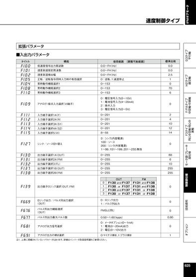 IPMギアモータオプション技術資料制御部仕様モータ部・ブレーキ部仕様F3タイプ同心中空軸・同心中実軸F/FAタイプ中空軸・中実軸H2タイプ直交軸G3タイプ平行軸0.00.02.5107060241012140686102552550000.80018250.0~FH(Hz)0.0~FH(Hz)0.0~FH(Hz)0:0~1530~1530~153逆転、1:減速停止0:1:2:3:電圧信号入力(0~10V)電流信号入力(4~20mA)接点入力電圧信号入力(0~5V)0~2010~2010~2010~2018~55シンク(内部電源)0:100:ソース200:シンク(外部電源)1~99、101~199、201~255:無効0~2550~2550~2550~2550~255OUTrF130andF137F130orF137F130andF137F130F137oFMF131andF138F131andF138F131orF138F131orF13801230:1:ロジック出力パルス列出力FMSLと同じ0.50~1.60(kpps)0:1:2:メータオプション(0~1mA)電流(0~20mA)出力電圧(0~10V)出力0:マイナス傾き、1:プラス傾き低速度信号出力周波数速度到達指定周波数速度到達検出幅正転/逆転指令同時入力時の有効選択常時動作機能選択1常時動作機能選択2常時動作機能選択3アナログ/接点入力選択(VI端子)入力端子選択1A(F)入力端子選択2A(R)入力端子選択3A(S1)入力端子選択4A(S2)入力端子選択5(VI)シンク/ソース切り替え出力端子選択1A(OUT)出力端子選択2A(FM)出力端子選択3(FL)出力端子選択1B(OUT)出力端子選択2B(FM)出力端子ロジック選択(OUT、FM)ロジック出力/パルス列出力選択(OUT)パルス列出力機能選択(OUT)パルス列出力最大パルス数アナログ出力信号選択アナログ出力の傾き選択注1.上表に掲載されていないパラメータもあります。詳細はインバータ取扱説明書をご参照ください。拡張パラメータ■入出力パラメータタイトル機能使用範囲〔調整可能範囲〕標準出荷