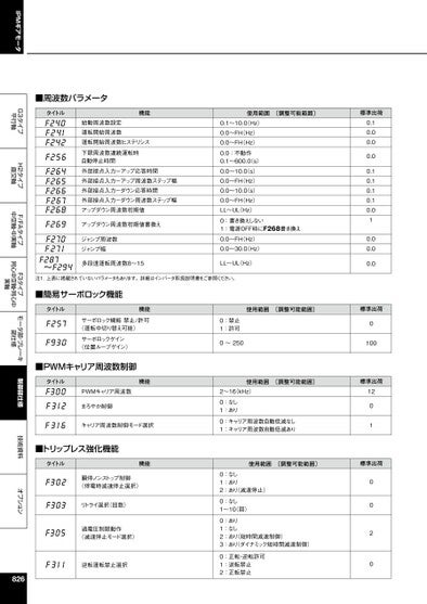 IPMギアモータG3タイプ平行軸H2タイプ直交軸F/FAタイプ中空軸・中実軸F3タイプ同心中空軸・同心中実軸モータ部・ブレーキ部仕様制御部仕様技術資料オプション■周波数パラメータタイトル機能使用範囲〔調整可能範囲〕標準出荷始動周波数設定運転開始周波数運転開始周波数ヒステリシス下限周波数連続運転時自動停止時間外部接点入力-アップ応答時間外部接点入力-アップ周波数ステップ幅外部接点入力-ダウン応答時間外部接点入力-ダウン周波数ステップ幅アップダウン周波数初期値アップダウン周波数初期値書換えジャンプ周波数ジャンプ幅~多段速運転周波数8~150.1~10.0(Hz)0.0~FH(Hz)0.0~FH(Hz)0.0:不動作0.1~600.0(s)0.0~10.0(s)0.0~FH(Hz)0.0~10.0(s)0.0~FH(Hz)LL~UL(Hz)0:1:書き換えしない電源OFF時にF268書き換え0.0~FH(Hz)0.0~30.0(Hz)LL~UL(Hz)0.10.00.00.00.10.10.10.10.010.00.00.0注1.上表に掲載されていないパラメータもあります。詳細はインバータ取扱説明書をご参照ください。■簡易サーボロック機能タイトル機能使用範囲〔調整可能範囲〕標準出荷サーボロック機能禁止/許可(運転中切り替え可能)サーボロックゲイン(位置ループゲイン)0:禁止1:許可0~2500100■PWMキャリア周波数制御タイトル機能使用範囲〔調整可能範囲〕標準出荷PWMキャリア周波数まろやか制御キャリア周波数制御モード選択2~16(kHz)0:1:なしあり0:1:キャリア周波数自動低減なしキャリア周波数自動低減あり1201■トリップレス強化機能タイトル機能使用範囲〔調整可能範囲〕標準出荷瞬停ノンストップ制御(停電時減速停止選択)リトライ選択(回数)過電圧制限動作(減速停止モード選択)逆転運転禁止選択8260:1:2:なしありあり(減速停止)なし0:1~10(回)0:1:2:3:ありなしあり(短時間減速制御)あり(ダイナミック短時間減速制御)0:1:2:正転・逆転許可逆転禁止正転禁止0020