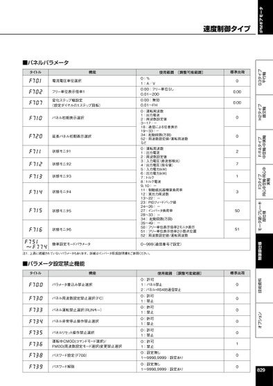 IPMギアモータオプション技術資料制御部仕様モータ部・ブレーキ部仕様F3タイプ同心中空軸・同心中実軸F/FAタイプ中空軸・中実軸H2タイプ直交軸G3タイプ平行軸■パネルパラメータタイトル機能使用範囲〔調整可能範囲〕標準出荷電流電圧単位選択フリー単位表示倍率1変化ステップ幅設定(設定ダイヤルの1ステップ回転)パネル初期表示選択延長パネル初期表示選択状態モニタ1状態モニタ2状態モニタ3状態モニタ4状態モニタ5状態モニタ6%A/V運転周波数出力電流周波数設定値0:1:0.00:フリー単位なし0.01-2000.00:無効0.01~FH0:1:2:3~17:-18:通信による任意表示19~33:-34:起動回数(万回)52:周波数設定値/運転周波数など運転周波数0:出力電流1:周波数設定値2:入力電圧(直流部検出)3:出力電圧(指令値)4:入力電力(kW)5:出力電力(kW):6:7トルク8:トルク電流9、10:-11:制動抵抗器積算負荷率12:実出力周波数13~22:-23:PIDフィードバック値24~26:-27:インバータ負荷率28~33:-34:起動回数(万回)35~49:-50:フリー単位表示倍率2モニタ表示51:フリー単位表示倍率2小数点位置52:周波数設定値/運転周波数00.000.000027135051~簡単設定モードパラメータ0-999(通信番号で設定)注1.上表に掲載されていないパラメータもあります。詳細はインバータ取扱説明書をご参照ください。■パラメータ設定禁止機能タイトル機能使用範囲〔調整可能範囲〕標準出荷パラメータ書込み禁止選択パネル周波数設定禁止選択(FC)パネル運転禁止選択(RUNキー)パネル非常停止操作禁止選択パネルリセット操作禁止選択運転中CMOD(コマンドモード選択)/FMOD(周波数設定モード選択)変更禁止選択パスワード設定(F700)パスワード解除許可パネル禁止パネル+RS485通信禁止許可禁止許可禁止許可禁止許可禁止許可禁止設定無し0:1:2:0:1:0:1:0:1:0:1:0:1:0:1~9998,999:設定あり0:1~9998,999:設定あり設定無し00000100829