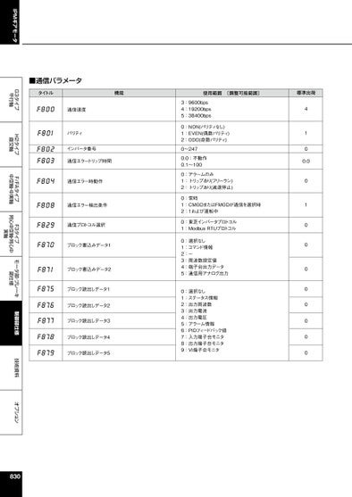 IPMギアモータG3タイプ平行軸H2タイプ直交軸F/FAタイプ中空軸・中実軸F3タイプ同心中空軸・同心中実軸モータ部・ブレーキ部仕様制御部仕様技術資料オプション■通信パラメータタイトル機能使用範囲〔調整可能範囲〕標準出荷通信速度パリティインバータ番号通信エラートリップ時間通信エラー時動作通信エラー検出条件通信プロトコル選択ブロック書込みデータ1ブロック書込みデータ2ブロック読出しデータ1ブロック読出しデータ2ブロック読出しデータ3ブロック読出しデータ4ブロック読出しデータ5:39600bps:419200bps5:38400bps0:1:2:NON(パリティなし)EVEN(偶数パリティ)ODD(奇数パリティ)0~2470.:不動作0.~1000:1:2:アラームのみトリップあり(フリーラン)トリップあり(減速停止)常時0:CMODまたはFMODが通信を選択時:12:1および運転中0:1:東芝インバータプロトコルModbusRTUプロトコル0:1:2:3:4:5:選択なしコマンド情報-周波数設定値端子台出力データ通信用アナログ出力0:1:2:3:4:5:6:7:8:9:選択なしステータス情報出力周波数出力電流出力電圧アラーム情報PIDフィードバック値入力端子台モニタ出力端子台モニタVI端子台モニタ4100.00100000000830