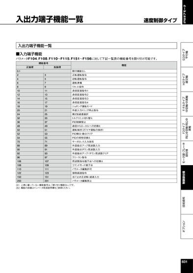 IPMギアモータオプション技術資料制御部仕様モータ部・ブレーキ部仕様F3タイプ同心中空軸・同心中実軸F/FAタイプ中空軸・中実軸H2タイプ直交軸G3タイプ平行軸入出力端子機能一覧入出力端子機能一覧■入力端子機能パラメータF104、F108、F110〜F115、F151〜F156に対して下記一覧表の機能番号を割り付け可能です。機能番号正論理負論理機能0.124681012141618202432364850525470889092961061081101221502003579111315171921253337495153557189919397107109111123151201割付機能なし正転運転指令逆転運転指令運転準備リセット指令多段変速指令1多段変速指令2多段変速指令3多段変速指令4ジョギング運転モード外部入力トリップ停止指令第2加減速選択トルクリミット切り替えPID制御禁止通信からローカルへの切換え運転保持(3ワイヤ運転の保持)PID積分・微分クリアPIDの特性切換えサーボロック入力信号外部接点アップ周波数入力外部接点ダウン周波数入力外部接点アップ/ダウン周波数クリアフリーラン指令周波数指令端子台への切換えコマンドモード端子台パラメータ編集許可強制減速指令当て止め正逆転・減速入力パラメータ編集禁止注1.上表に載っていない機能番号は、割り付け機能なし」です。注2.機能の詳細はインバータ取扱説明書をご参照ください。831