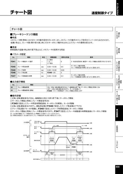 IPMギアモータオプション技術資料制御部仕様モータ部・ブレーキ部仕様F3タイプ同心中空軸・同心中実軸F/FAタイプ中空軸・中実軸H2タイプ直交軸G3タイプ平行軸チャート図チャート図■ブレーキシーケンス機能●特長・メカブレーキ開・閉時におけるモータの動作設定を行います。また、メカブレーキの動作タイミング信号をインバータから出力させます。・起動/停止と、ブレーキ開/閉の受け渡し時にのみサーボロック動作をはさむことでブレーキの磨耗を抑えます。●用途昇降運転の起動・停止時の落下防止など、メカブレーキを使用する用途●パラメータ設定No.機能単位調整範囲標準出荷値備考F341ブレーキ機能モード選択F345ブレーキ釈放時間F340F346F347クリープ時間クリープ周波数ブレーキ制動遅れ時間●出力端子機能No.6869機能ブレーキ開放信号ブレーキ開放信号(反転)—secsecHzsec0:無効1、2:-3:有効0.00〜10.000.00〜10.00F240〜200.00〜10.0000.50.0030.33:有効を設定時、簡易サーボロック機能は使用できなくなります。サーボロック動作時間。ブレーキ開放遅れ時間に合うように設定します。サーボロック動作時間。ブレーキ制動遅れ時間に合うように設定します。ON:正転/逆転運転指令ONして、磁極検出終了後、サーボロック開始と同時にONOFF:正転/逆転運転指令OFFし、モータが減速して、F340:クリープ時間後サーボロック開始と同時にOFF動作●動作詳細①正転/逆転運転指令がONし、磁極検出(約0.15秒)終了後にサーボロック開始②サーボロック開始と同時にブレーキ開放信号ON③F345で設定したブレーキ釈放時間経過後、サーボロックを解除し、モータが駆動④正転/逆転運転指令がOFFし、運転周波数がF346で設定したクリープ周波数まで下がる⑤クリープ周波数でモータが駆動し、F340で設定したクリープ時間経過後にサーボロック開始⑥サーボロック開始と同時にブレーキ開放信号がOFFし、F347で設定したブレーキ制動遅れ時間経過後にサーボロック解除注1.出力端子機能「ブレーキ開放信号」は、F341=3(有効)にしないと出力しません。注2.標準出荷設定で、出力端子OUTにブレーキ開放信号(No.68)が割付られています。入力信号ギアモータ動作正転/逆転信号入力実ブレーキ動作サーボロック動作運転周波数出力信号ブレーキ開放信号出力動作詳細No.ブレーキ開ブレーキ閉サーボロックONブレーキ釈放時間F345サーボロックONクリープ時間F340ブレーキ制御遅れ時間F347クリープ周波数F346磁極検出位置保持制御②①③速度制御位置保持制御④⑤⑥時間時間時間時間時間833