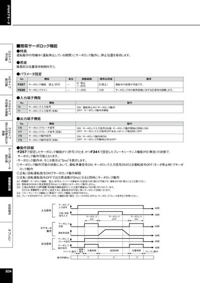 IPMギアモータG3タイプ平行軸H2タイプ直交軸F/FAタイプ中空軸・中実軸F3タイプ同心中空軸・同心中実軸モータ部・ブレーキ部仕様制御部仕様技術資料オプション■簡易サーボロック機能●特長運転動作の待機中(運転停止している期間)にサーボロック動作し、停止位置を保持します。●用途簡易的な位置保持制御を行う。●パラメータ設定No.F257F930機能単位調整範囲標準出荷値備考サーボロック機能禁止/許可サーボロックゲイン——0:禁止1:許可1〜2500禁止)運転中の変更が可能です。100サーボロック中の負荷変動に対する応答性を調整します。●入力端子機能No.7071機能サーボロック入力信号サーボロック入力信号(反転)●出力端子機能No.176177178179機能サーボロックブレーキ信号サーボロックブレーキ信号(反転)サーボロック動作信号サーボロック動作信号(反転)ON:運転停止中にサーボロック動作OFF:サーボロック動作を解除動作動作ON:サーボロック入力信号ON後、サーボロック動作開始と同時にONOFF:サーボロック入力信号OFFあるいはトリップ発生時にOFFON:サーボロック動作時ONOFF:サーボロック作動時以外はOFF●動作詳細・F257で設定したサーボロック機能が1(許可)のとき、かつF341で設定したブレーキシーケンス機能が0(無効)の状態で、サーボロック動作可能となります。・サーボロック動作中、モニタ表示は“Srvo”を表示します。①サーボロック動作可能の状態において、運転準備信号ON、サーボロック入力信号ONのとき運転指令OFF(モータ停止時)でサーボロック動作②正転/逆転運転指令ONでサーボロック動作解除③正転/逆転運転指令OFFで出力周波数が0Hzになると同時にサーボロック動作注1.F257:サーボロック機能禁止/許可は、インバータ運転中でも設定の切り替えが可能です。運転中の切り替えにはご注意ください。注2.運転指令ON中に周波数設定を0Hzにした場合にはサーボロック動作しません。注3.工場出荷設定ではF108(常時動作機能選択2)に入力端子機能No.70が割り付けられています。そのため、F257を1許可)に設定すると、運転指令OFF時に常にサーボロック状態になります。注4.ブレーキシーケンス機能』と『簡易サーボロック機能』は併用できません。注5.ブレーキ付IPMギアモータでサーボロック機能を使う場合、ブレーキのON/OFFは、サーボロックブレーキ信号をご利用ください。入力信号ギアモータ動作出力信号サーボロック入力信号正転/逆転信号入力サーボロック状態運転周波数サーボロックブレーキ信号サーボロック動作信号フリーラン動作サーボロックONサーボロックOFFサーボロックON磁極検出位置制御速度制御位置制御時間時間時間時間時間時間フリーラン動作動作詳細No.①②③834