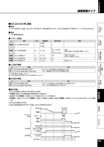 IPMギアモータオプション技術資料制御部仕様モータ部・ブレーキ部仕様F3タイプ同心中空軸・同心中実軸F/FAタイプ中空軸・中実軸H2タイプ直交軸G3タイプ平行軸■当て止め/当て押し機能●特長一つの入力信号で、減速→当て止め→当て押しの一連の動作を行います。当て止め状態完了の信号をインバータから出力させます。●用途ワークの簡易位置決め●パラメータ設定No.機能単位調整範囲標準出荷値備考F382当て止め機能有効/無効—0:無効1:-2:有効0F383当て止め周波数設定Hz0.1〜3057.5(0.1k〜0.4kW)(0.75k〜2.2kW)F384F385F386当て止め制限トルク当て止め検出時間当て押し制限トルク●入力端子機能%sec%0〜1200.0〜25.00〜1001000.310注意!標準出荷値以下の周波数で調整してください。定格トルク比注意!5%以上で調整してください。定格トルク比動作No.150151機能当止め正逆転・減速入力信号当止め正逆転・減速入力信号(反転)ON:当て止め周波数設定の回転速度に切り替えOFF:通常運転(ON⇒OFF時、通常運転に戻る)注1.信号は保持入力信号としてください。注2.正転/逆転指令の優先順位は、当て止め減速信号より上位です。●出力端子機能No.174175機能当止め状態出力信号当止め状態出力信号(反転)ON:モータが拘束され、当て押し制限トルクに切り替えでONOFF:正転/逆転運転指令OFFで出力OFF動作●動作詳細①当て止め減速入力信号がON(保持入力信号)②F383で設定した低速周波数(回転速度)まで減速する③減速完了後、F384にて設定したトルクを検出するモードに切り替える④F384にて設定したトルクが、F385にて設定した時間以上経過した場合、F386にて設定したトルク以上出力が出ないように制限する⑤当て止め状態出力がON⑥正転/逆転運転指令がOFFした場合、当て止め状態出力をOFFギアモータ動作回転速度F383電流/トルクF384F386正転/逆転入力信号発生トルクの監視。入力信号当て止め減速入力信号当て止め状態出力信号出力信号当て止め対象F385位置時間時間時間時間動作詳細No.①②③④⑤⑥835
