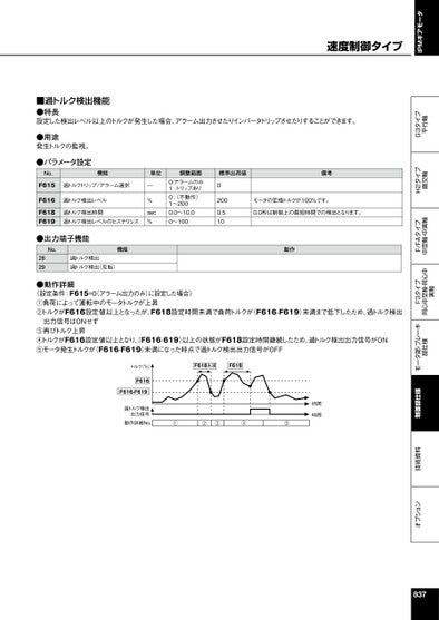IPMギアモータオプション技術資料制御部仕様モータ部・ブレーキ部仕様F3タイプ同心中空軸・同心中実軸F/FAタイプ中空軸・中実軸H2タイプ直交軸G3タイプ平行軸■過トルク検出機能●特長設定した検出レベル以上のトルクが発生した場合、アラーム出力させたりインバータトリップさせたりすることができます。●用途発生トルクの監視。●パラメータ設定No.機能単位F615過トルクトリップ/アラーム選択F616F618F619過トルク検出レベル過トルク検出時間過トルク検出レベルのヒステリシス—%sec%調整範囲0:アラームのみ1:トリップあり0:(不動作)1〜2000.0〜10.00〜100標準出荷値備考02000.510モータの定格トルクが100%です。0.0秒は制御上の最短時間での検出となります。●出力端子機能No.2829機能過トルク検出過トルク検出(反転)動作●動作詳細〈設定条件:F615=0(アラーム出力のみ)に設定した場合〉①負荷によって運転中のモータトルクが上昇②トルクがF616設定値以上となったが、F618設定時間未満で負荷トルクが(F616-F619)未満まで低下したため、過トルク検出出力信号はONせず③再びトルク上昇④トルクがF616設定値以上となり、F616-619)以上の状態がF618設定時間継続したため、過トルク検出出力信号がON⑤モータ発生トルクが(F616-F619)未満になった時点で過トルク検出出力信号がOFFトルク(%)F616(F616-F619)過トルク検出出力信号動作詳細No.F618未満F618①②③④⑤時間時間837