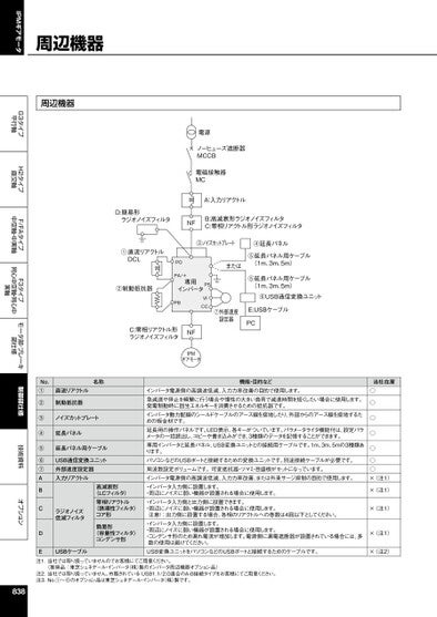 IPMギアモータG3タイプ平行軸H2タイプ直交軸F/FAタイプ中空軸・中実軸F3タイプ同心中空軸・同心中実軸モータ部・ブレーキ部仕様制御部仕様技術資料オプション周辺機器周辺機器D:簡易形ラジオノイズフィルタ①直流リアクトルDCLPO電源ノーヒューズ遮断器MCCB電磁接触器MCA:入力リアクトルNFB:高減衰形ラジオノイズフィルタC:零相リアクトル形ラジオノイズフィルタ③ノイズカットプレート④延長パネルまたはP5⑤延長パネル用ケーブル(1m、3m、5m)⑤延長パネル用ケーブル(1m、3m、5m)⑥USB通信変換ユニット②制動抵抗器PA/+専用インバータPBVICCC:零相リアクトル形ラジオノイズフィルタNFIPMギアモータ⑦外部速度設定器E:USBケーブルPCNo.①②③④⑤⑥⑦ABCDE名称直流リアクトル制動抵抗器ノイズカットプレート延長パネル延長パネル用ケーブルUSB通信変換ユニット外部速度設定器入力リアクトル高減衰形(LCフィルタ)零相リアクトル(誘導性フィルタ)コア形簡易形(容量性フィルタ)コンデンサ形ラジオノイズ低減フィルタUSBケーブル機能・目的など当社在庫インバータ電源側の高調波低減、入力力率改善の目的で使用します。急減速や停止を頻繁に行う場合や慣性の大きい負荷で減速時間を短くしたい場合に使用します。発電制動時に回生エネルギーを消費させるための抵抗器です。インバータ動力配線のシールドケーブルのアース線を接地したり、外部からのアース線を接地するための板金材です。延長用の操作パネルです。LED表示、各キーがついています。パラメータライタ機能付は、設定パラメータの一括読出し、コピーや書き込みができ、3種類のデータを記憶することができます。専用インバータと延長パネル、USB変換ユニットとの接続用ケーブルです。1m、3m、5mの3種類あります。パソコンなどのUSBポートと接続するための変換ユニットです。別途接続ケーブルが必要です。周波数設定ボリュームです。可変抵抗器・ツマミ・目盛板がセットになっています。インバータ電源側の高調波低減、入力力率改善、または外来サージ抑制の目的で使用します。・インバータ入力側に設置します。・周辺にノイズに弱い機器が設置される場合に使用します。・インバータ入力側と出力側に設置できます。・周辺にノイズに弱い機器が設置される場合に使用します。注意!:出力側に設置する場合、各相のリアクトルへの巻数は4回以下としてください。・インバータ入力側に設置します。・周辺にノイズに弱い機器が設置される場合に使用します。・コンデンサ形のため漏れ電流が増加します。電源側に漏電遮断器が設置されている場合には、多数の使用は避けてください。USB変換ユニットをパソコンなどのUSBポートと接続するためのケーブルです。○○○○○○○×(注1)×(注1)×(注1)×(注1)×(注2)注1.当社では取り扱っていませんのでお客様にてご用意ください。(推奨品:東芝シュネデール・インバータ(株)製のインバータ周辺機器オプション品)注2.当社では取り扱っていません。市販されているUSB1.1/2.0適合のA-B接続タイプをお客様にてご用意ください。注3.No.①〜⑥のオプション品は東芝シュネデール・インバータ(株)製です。838