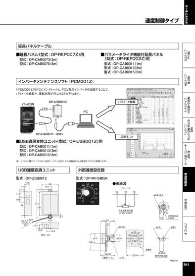 IPMギアモータオプション技術資料制御部仕様モータ部・ブレーキ部仕様F3タイプ同心中空軸・同心中実軸F/FAタイプ中空軸・中実軸H2タイプ直交軸G3タイプ平行軸延長パネルケーブル■延長パネル(型式:OP-RKP007Z)用型式:OP-CAB0073(3m)型式:OP-CAB0075(5m)■パラメータライタ機能付延長パネル(型式:OP-RKP002Z)用型式:OP-CAB0011(1m)型式:OP-CAB0013(3m)型式:OP-CAB0015(5m)インバータメンテナンスソフト『PCM001Z』『PCM001Z』をPCにインストールし、PCと専用インバータを接続することで、パラメータ編集や、運転状態のモニタなどが行えます。VF-nC3MOP-USB001Zパラメータ編集PCOP-CAB0011~0015■USB通信変換ユニット(型式:OP-USB001Z)用状態モニタ型式:OP-CAB0011(1m)型式:OP-CAB0013(3m)型式:OP-CAB0015(5m)注1.パソコン側のケーブルはUSBケーブル(USB1.1/2.0適合のA-B接続タイプ)をご使用ください。USB通信変換ユニット外部速度設定器型式:OP-USB001Z型式:OP-RV-24B5K2131.619.98812819.660161129032穴27.119.6単位:mm513.2●接続図インバータCCVIP5213外部速度設定器OP-RV-24B5K130.2120.4φ2.8±0.2①③10可変抵抗器B5KΩM3×0.5φ3.2φ9.5φ2440φ15.93020105040607080901000MIN35絶縁フィルムツマミ40目盛板10±0.5取付穴加工図単位:mm841