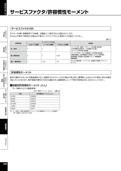 IPMギアモータG3タイプ平行軸H2タイプ直交軸F/FAタイプ中空軸・中実軸F3タイプ同心中空軸・同心中実軸モータ部・ブレーキ部仕様制御部仕様技術資料オプションサービスファクタ/許容慣性モーメントサービスファクタ(Sf)ギアモータは軽い衝撃負荷で10時間/日運転という条件のもとで設計されています。それ以上の条件で使用される場合は下表のサービスファクタにより負荷トルクを補正してください。負荷状態均一負荷軽い衝撃負荷激しい衝撃負荷111サービスファクタ(Sf)3H以下/日運転3~10H/日運転10H以上/日運転用途例[表-1]111.2511.251.5コンベア(均一負荷)、スクリーン、混合機(低粘度)、水処理機械(軽負荷)、工作機械(送り軸)、エレベータ、押出機、蒸留機コンベア(不均一、または重負荷)、混合機(高粘度)、車輛用機械、水処理機械(中負荷)、ホイスト(軽荷重)、製紙機械、供給機、食品機械、ポンプ、精糖機械、繊維機械ホイスト(重荷重)、ハンマーミル、金属加工機械、クラッシャ、タンブラ許容慣性モーメント負荷の慣性が大きいものを断続運転すると、起動時(またはブレーキ付の場合の停止時)に瞬間的に大きなトルクが発生し思わぬ事故を起こすことがあります。相手機械の慣性の大きさは連結方式、起動頻度によって下表の許容値以内になるようにしてください。■容量別許容慣性モーメントJ(JA)(モータ軸または入力軸換算値)三相単位:慣性モーメントJ(kg・m2)許容慣性モーメントJJA)[表-2]0.1kW0.2kW0.4kW0.75kW1.5kW2.2kW0.00080.00100.00150.00300.0080.011注1.モータ軸(入力軸)換算慣性モーメントJ=出力軸慣性モーメントJ×(減速比)2(例:減速比1/20ならば1/400)846