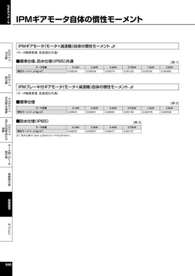 IPMギアモータG3タイプ平行軸H2タイプ直交軸F/FAタイプ中空軸・中実軸F3タイプ同心中空軸・同心中実軸モータ部・ブレーキ部仕様制御部仕様技術資料オプションIPMギアモータ自体の慣性モーメントIPMギアモータ(モータ+減速機)自体の慣性モーメントJr〈モータ軸換算値、各減速比共通〉■標準仕様、防水仕様(IP65)共通[表-1]モータ容量0.1kW0.2kW0.4kW0.75kW1.5kW2.2kW慣性モーメントJr(kg・m2)0.000340.000340.000740.001280.003340.00495IPMブレーキ付ギアモータ(モータ+減速機)自体の慣性モーメントJr〈モータ軸換算値、各減速比共通〉■標準仕様[表-2]モータ容量0.1kW0.2kW0.4kW0.75kW1.5kW2.2kW慣性モーメントJr(kg・m2)0.000410.000410.000810.001400.003780.00539■防水仕様(IP65)モータ容量慣性モーメントJr(kg・m2)0.1kW0.2kW0.4kW0.75kW0.000370.000370.000770.00137[表-3]注1.防水仕様の1.5kW、2.2kWはブレーキ付はありません。848