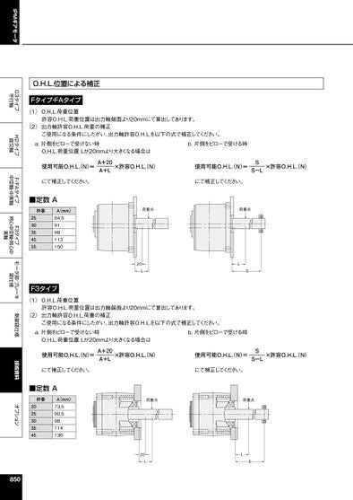 IPMギアモータG3タイプ平行軸H2タイプ直交軸F/FAタイプ中空軸・中実軸F3タイプ同心中空軸・同心中実軸モータ部・ブレーキ部仕様制御部仕様技術資料オプションO.H.L.位置による補正Fタイプ・FAタイプ(1)O.H.L.荷重位置許容O.H.L.荷重位置は出力軸端面より20mmにて算出してあります。(2)出力軸許容O.H.L.荷重の補正ご使用になる条件にしたがい、出力軸許容O.H.L.を以下の式で補正してください。a.片側をピローで受けない時O.H.L.荷重位置Lが20mmより大きくなる場合は使用可能O.H.L.(N)=×許容O.H.L.(N)A+20A+Lb.片側をピローで受ける時使用可能O.H.L.(N)=×許容O.H.L.(N)SS-Lにて補正してください。にて補正してください。■定数A枠番A(mm)253035455584.59198113150F3タイプ(1)O.H.L.荷重位置荷重点荷重点20LLS許容O.H.L.荷重位置は出力軸端面より20mmにて算出してあります。(2)出力軸許容O.H.L.荷重の補正ご使用になる条件にしたがい、出力軸許容O.H.L.を以下の式で補正してください。a.片側をピローで受けない時O.H.L.荷重位置Lが20mmより大きくなる場合は使用可能O.H.L.(N)=×許容O.H.L.(N)A+20A+Lb.片側をピローで受ける時使用可能O.H.L.(N)=×許容O.H.L.(N)SS-Lにて補正してください。にて補正してください。■定数A枠番A(mm)202530354573.590.598114136850荷重点荷重点20LLS