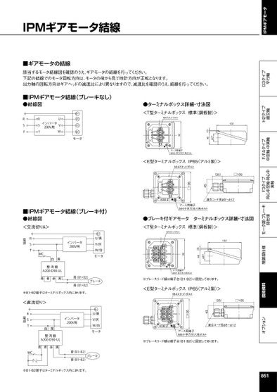 IPMギアモータオプション技術資料制御部仕様モータ部・ブレーキ部仕様F3タイプ同心中空軸・同心中実軸F/FAタイプ中空軸・中実軸H2タイプ直交軸G3タイプ平行軸102φ2746(3)92U1V1W1●ターミナルボックス詳細・寸法図<T型ターミナルボックス標準(鋼板製)>M4スタッドボルトアース用端子M4十字穴付六角ボルト<E型ターミナルボックスIP65(アルミ製)>M4スタッドボルト(35)□105適合コード径φ8~φ12アース用端子M4十字穴付六角ボルト45□105U1V1W1E-BOX●ブレーキ付ギアモータターミナルボックス詳細・寸法図<T型ターミナルボックス標準(鋼板製)>M4スタッドボルト102φ2746(3)92B2B1U1V1W1アース用端子M4十字穴付六角ボルト※ブレーキリード線は端子台(B1・B2)に固定してあります。<E型ターミナルボックスIP65(アルミ製)>M4スタッドボルト(35)□105適合コード径φ8~φ12アース用端子M4十字穴付六角ボルト45□105B2B1U1V1W1E-BOX※ブレーキリード線は端子台(B1・B2)に固定してあります。■IPMギアモータ結線(ブレーキなし)●結線図U1V1W1モータUVWインバータ200V用RSTRST■IPMギアモータ結線(ブレーキ付)●結線図<交流切りA>インバータ200V用U/黒V/灰W/白モータ青(B1・B2)青(B1・B2)ブレーキMC白黄整流器A200-D90-UL青青赤黒RST電源インバータ200V用U/黒V/灰W/白モータ黄白整流器A200-D90-ULRST電源※B1・B2端子はターミナルボックス内にあります。<直流切り>青青赤黒MC青(B1・B2)青(B1・B2)ブレーキIPMギアモータ結線■ギアモータの結線該当するモータ結線図を確認のうえ、ギアモータの結線を行ってください。下記の結線でのモータ回転方向は、モータの後から見て時計方向が正転となります。出力軸の回転方向はギアヘッドの減速比により異なりますので、減速比を確認のうえ、結線を行ってください。※B1・B2端子はターミナルボックス内にあります。851
